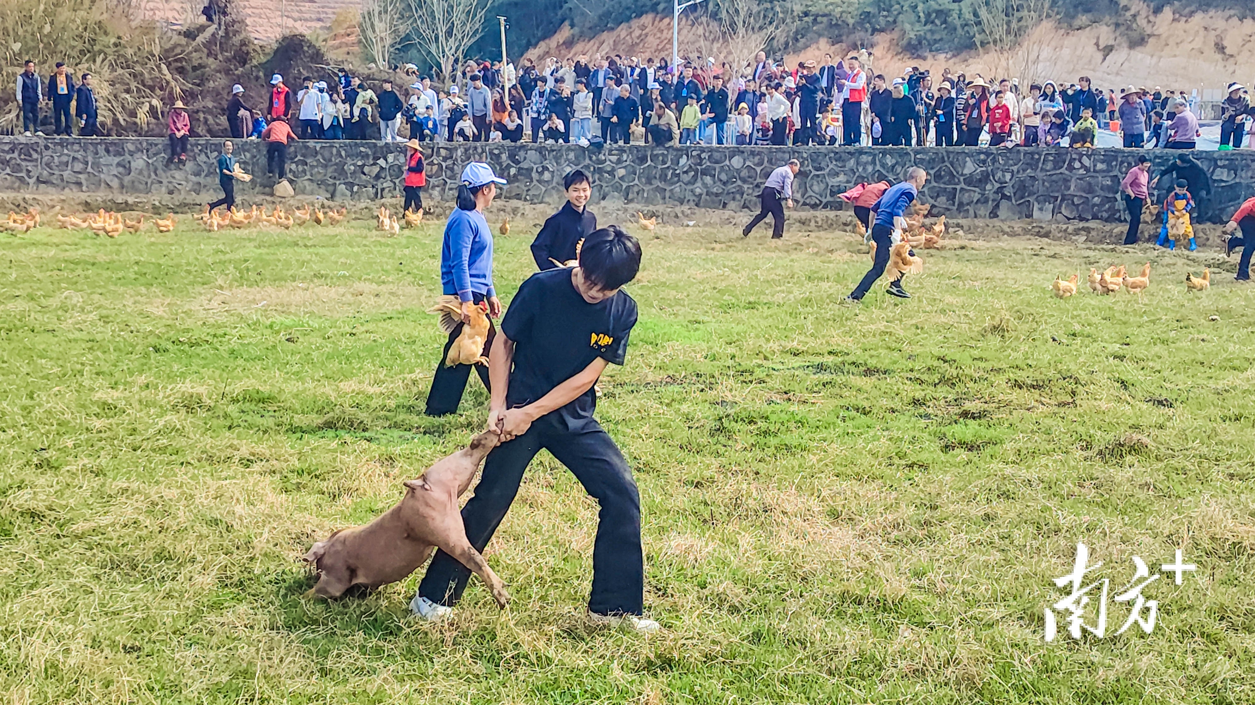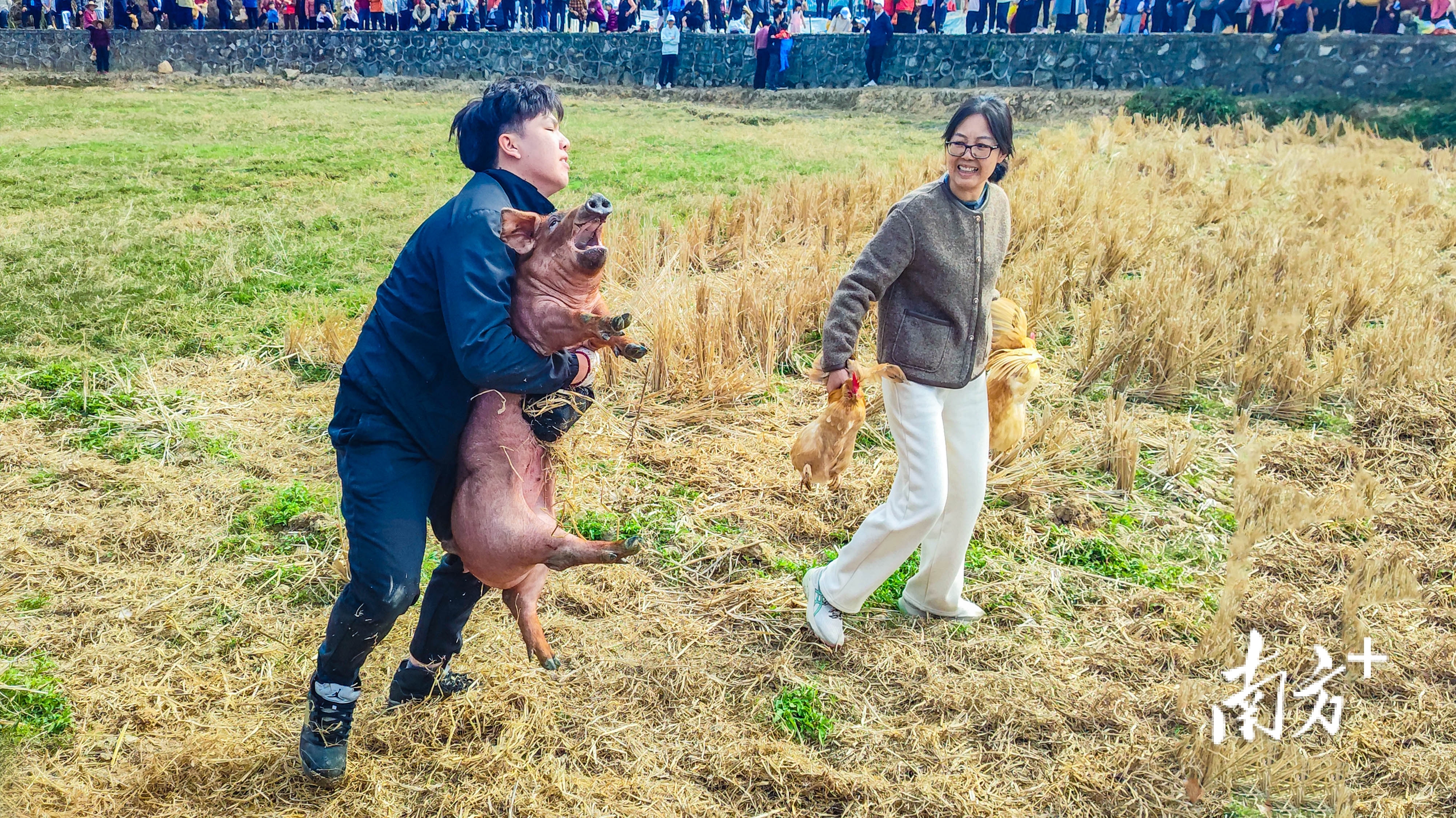 与此同时,农家趣味竞赛区同样人气火爆。“抓鸡抓猪”比赛在划定区域内进行,家养土鸡、土猪灵活奔跑,参赛者们需通过自己的智慧和技巧将其“制服”,趣味十足的场景引得观众笑声不断、喝彩连连。
