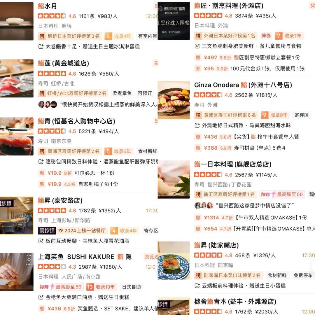 从人均上千元高档餐厅“鮨龍”“鮨然”“鮨禅·会席”“鮨禾”“鮨膳”“鮨藤本 Sushi Fujimoto”“鮨亮”,到人均200~600元的“鮨桐日本料理”“鮨政·Omakase”“鮨鲸·海鲜丼”“鮨煦板前寿司”“鮨拾稹”“一麟ITIRINN·鮨”“鮨心屋”“鮨鳯”,都是清一色的“鮨”家人。