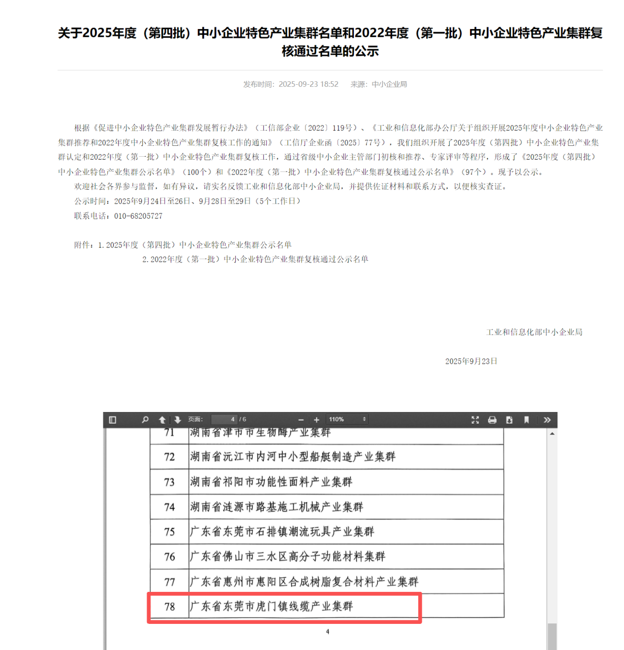 9月23日,工业和信息化部公示的《2025年度(第四批)中小企业特色产业集群名单》中,虎门镇线缆产业集群成功入选。此批次全国评审100个集群,广东省仅有6个入选,虎门占得一席。详情→