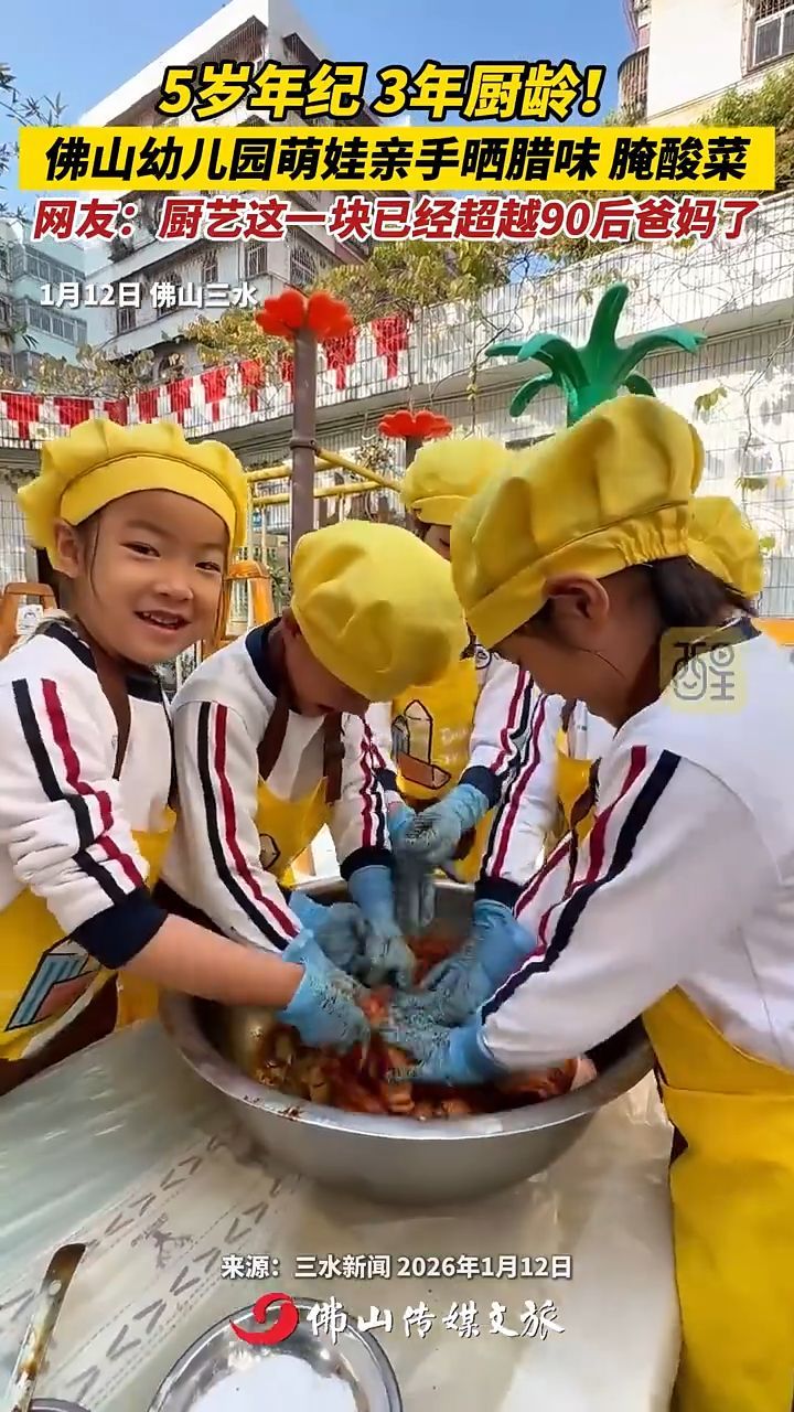 据悉,这些孩子平时在园内接受劳动教育,还参与了晒腊味、腌酸菜等活动。视频中,孩子们熟练处理食材的动作引发热议。超萌“厨神”>>
