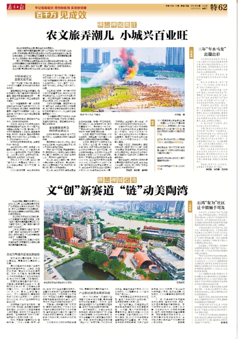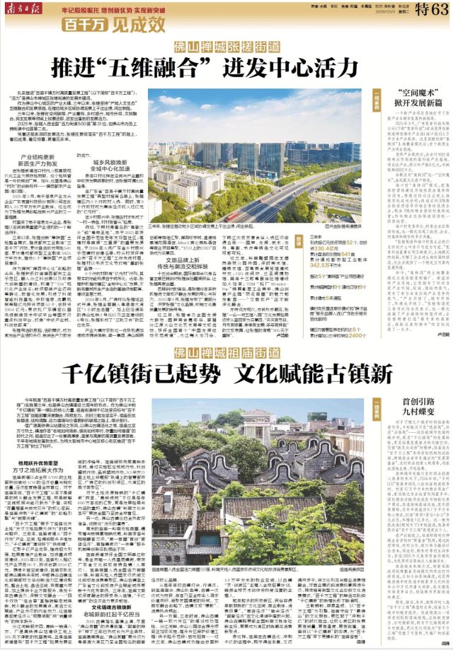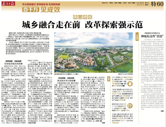 12月23日,南方日报刊发《百千万 见成效——广东深入实施“百千万工程”特别报道》,禅城区、镇(街道)、村协同发力,推进“百千万工程”的生动实践、创新探索引发广泛关注。禅城努力走在前、当示范,塑造地级市中心城区城乡区域协调发展样板,在“三年初见成效”的关键节点,交出了一份高质量发展答卷。