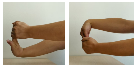 屈腕牵拉:手臂向前伸直,掌心向上,用另一只手轻轻向下掰手指(使手腕掌屈),直到前臂感到牵拉感。保持 15-30 秒,重复 2-3 次。