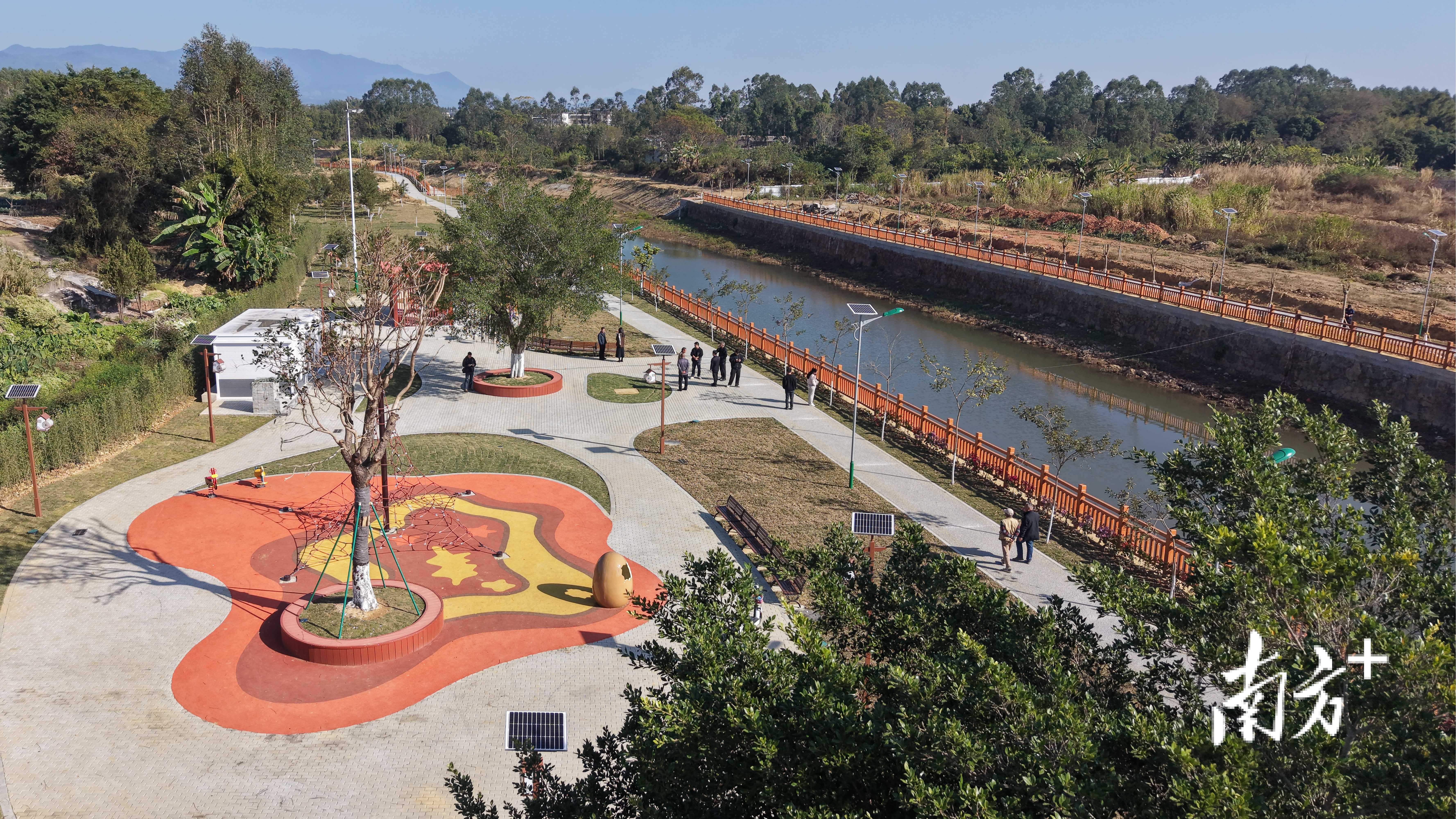 在石坝广场一侧,1.5公里长的美丽河道两岸安装了明亮的新路灯,沿岸的绿道和人行栈桥,成了圩镇居民夜晚休闲散步的好去处,与文化体育广场、绿美生态小公园、沿河休闲小公园等连片升级,成为集娱乐休闲、运动健身等功能的综合体。