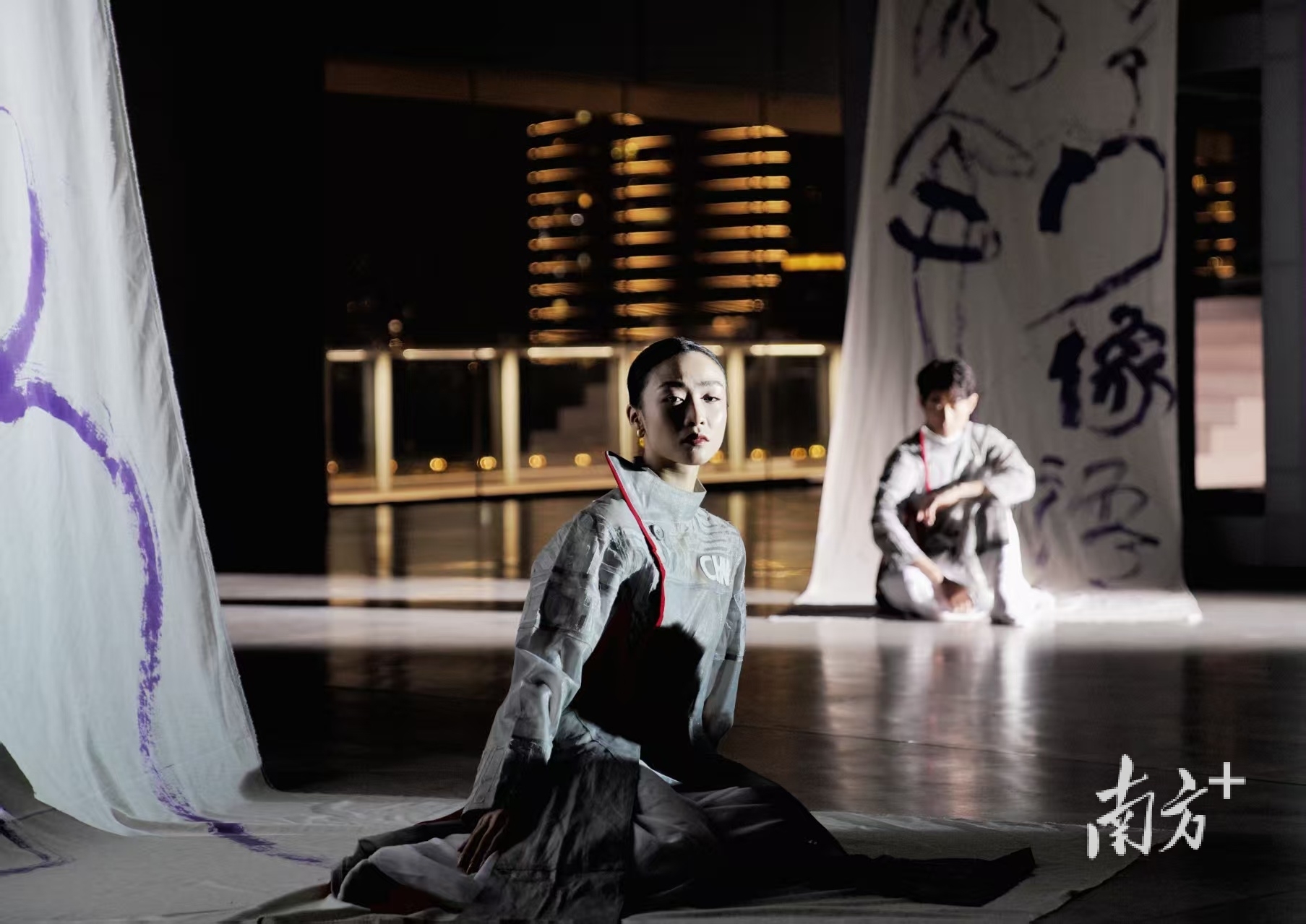 本次新年诗会的舞台设计别具巧思,现场放置了七座6米高的立方体装置,通过移动产生28种变化,衍生出多个小舞台。戏剧、舞蹈、器乐演奏、合唱等节目都在上面完成。这种设计巧妙地打破了诗歌与电影“线性叠加”的局限,以空间为轴,实现二者的维度升级。在珠江夜景的映衬下,演员穿梭在这些立方体之间,完成了一场对“诗歌电影”本质的解构与重构。