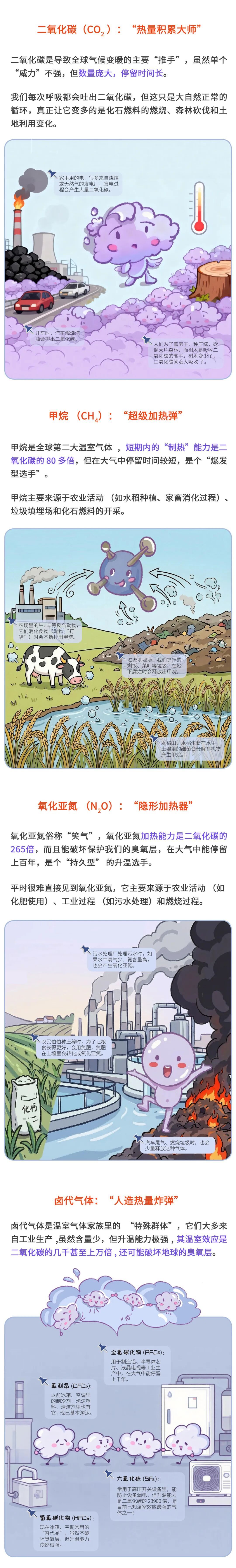 那么,究竟是哪些“气”在让地球变热呢?揭开这份“温室气体秘密档案”,你会发现,它们之中有数量庞大的“热量积累大师”二氧化碳,有短期爆发力极强的甲烷“超级加热弹”,还有能停留上百年的“隐形加热器”氧化亚氮……