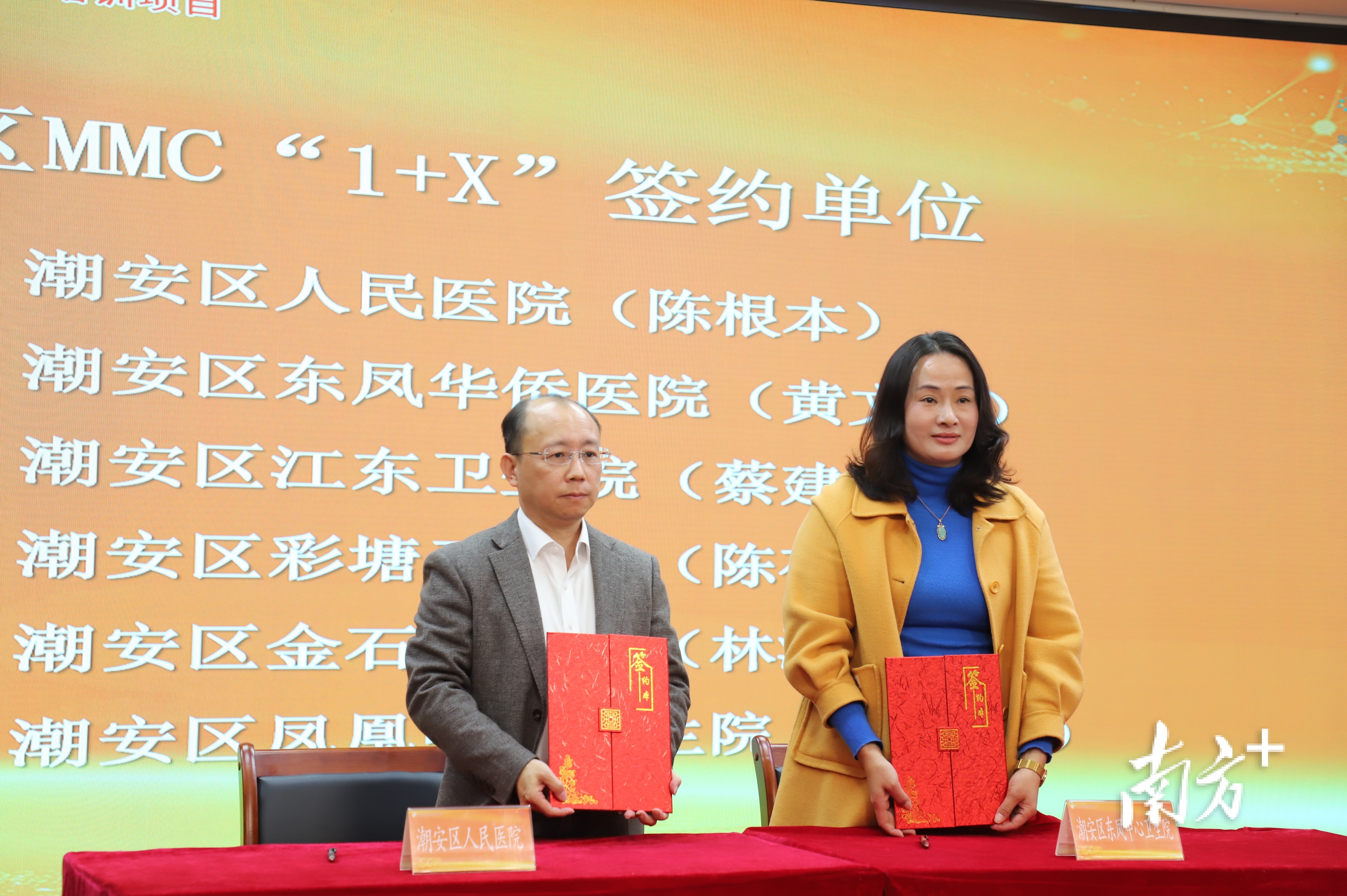活动现场,潮安区人民医院分别与东凤华侨医院、江东卫生院、彩塘卫生院、金石卫生院、凤凰中心卫生院签订MMC“1+X”合作协议。潮安MMC“1+X”模式,以潮安区人民医院MMC为总中心,在基层医院建设MMC分中心,形成上下联动、标准统一的慢病管理网络。