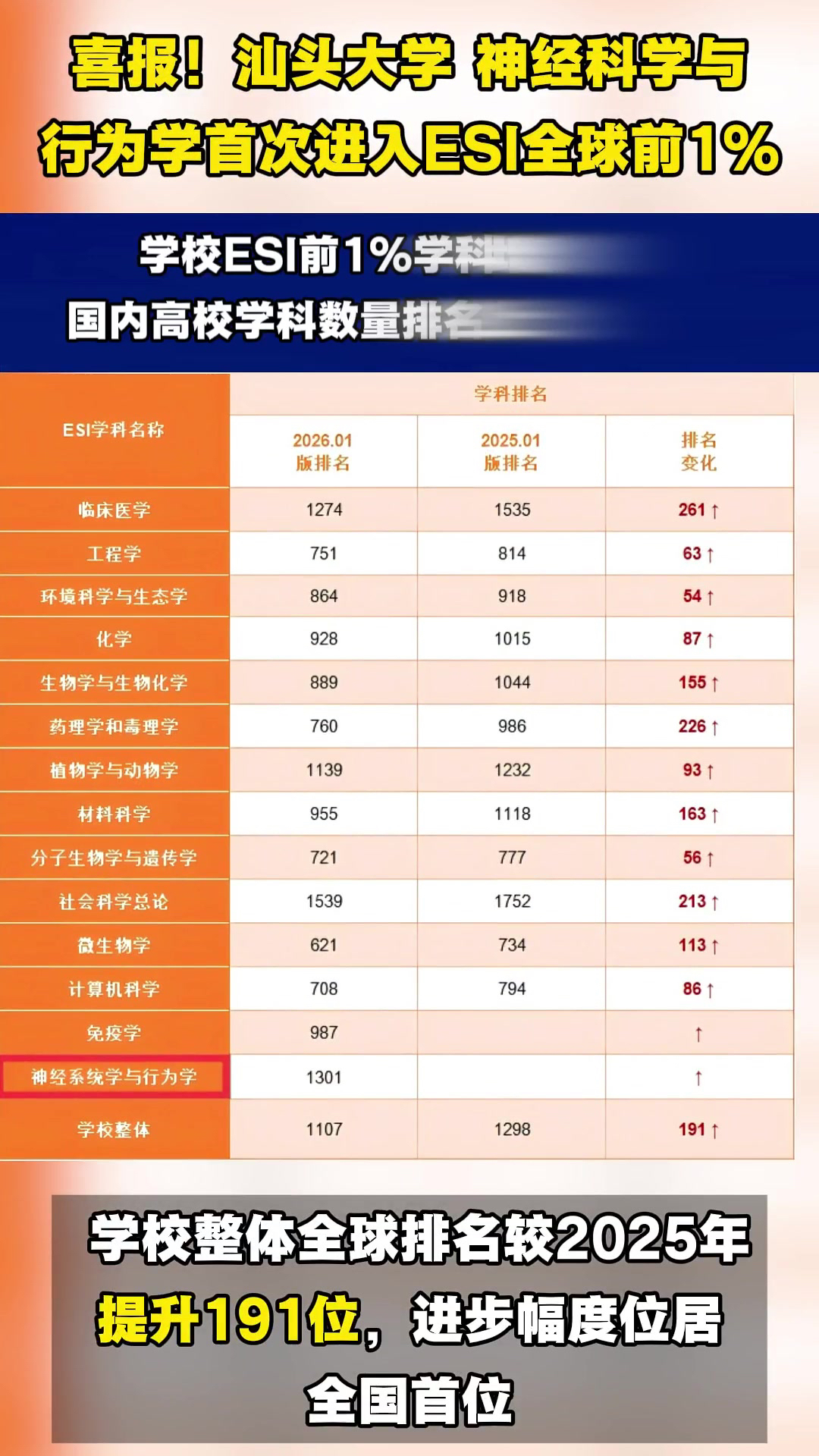 1月8日,科睿唯安公布了基本科学指标数据库ESI(Essential Science Indicators,简称ESI)最新统计数据。南方+记者从汕头大学获悉,该校整体全球排名较2025年提升191位,国内高校学科数量排名上升至第49位,2025年进步幅度位居全国首位;该校原有12个ESI前1%学科全部实现排名进位,其中6个学科进步超过100位,展现出扎实的学科基础和持续的发展动能。