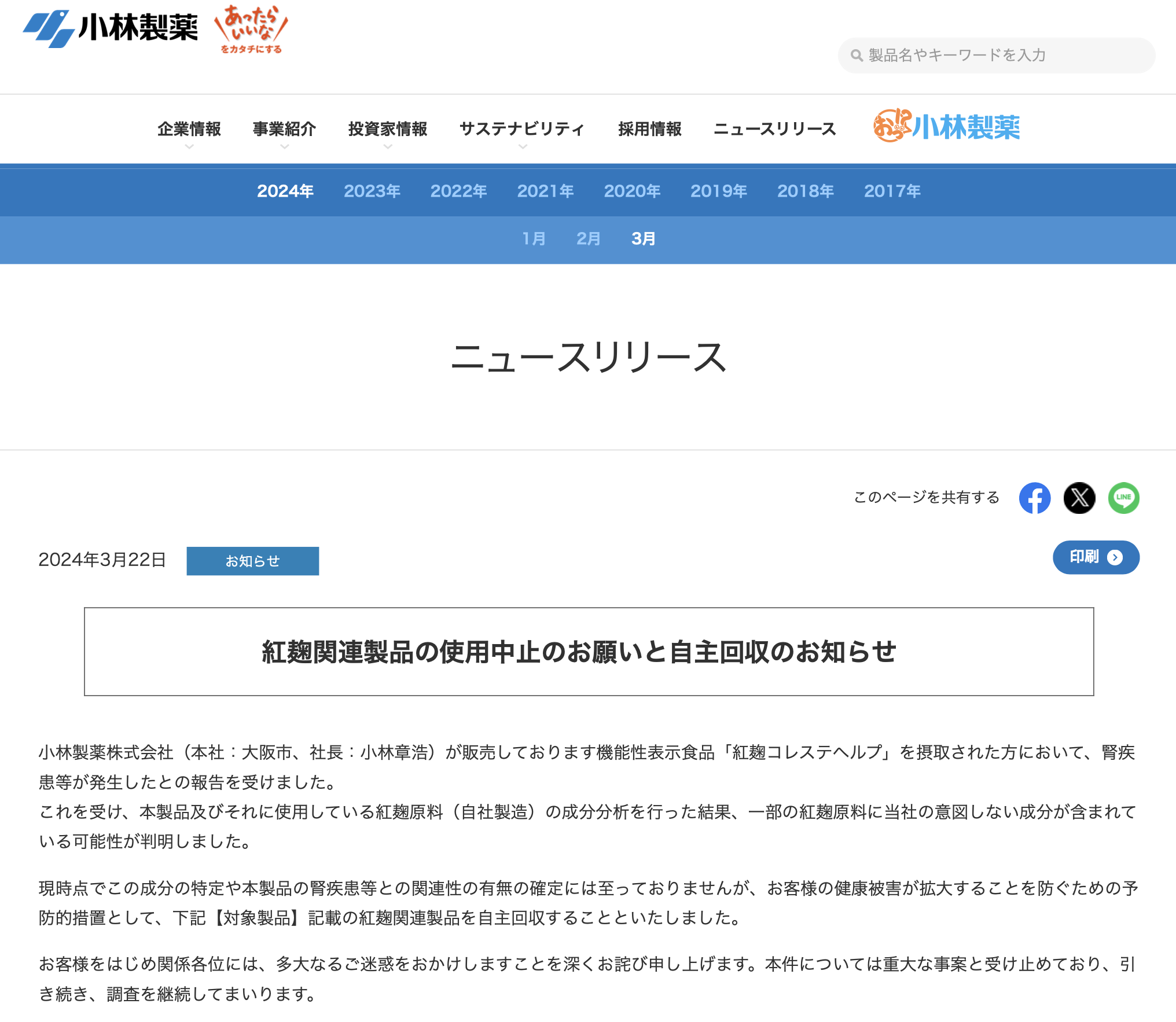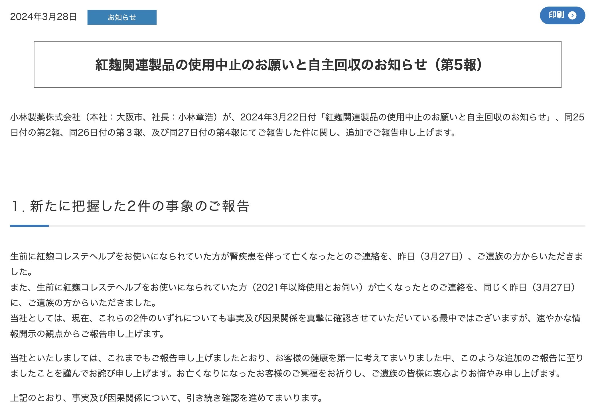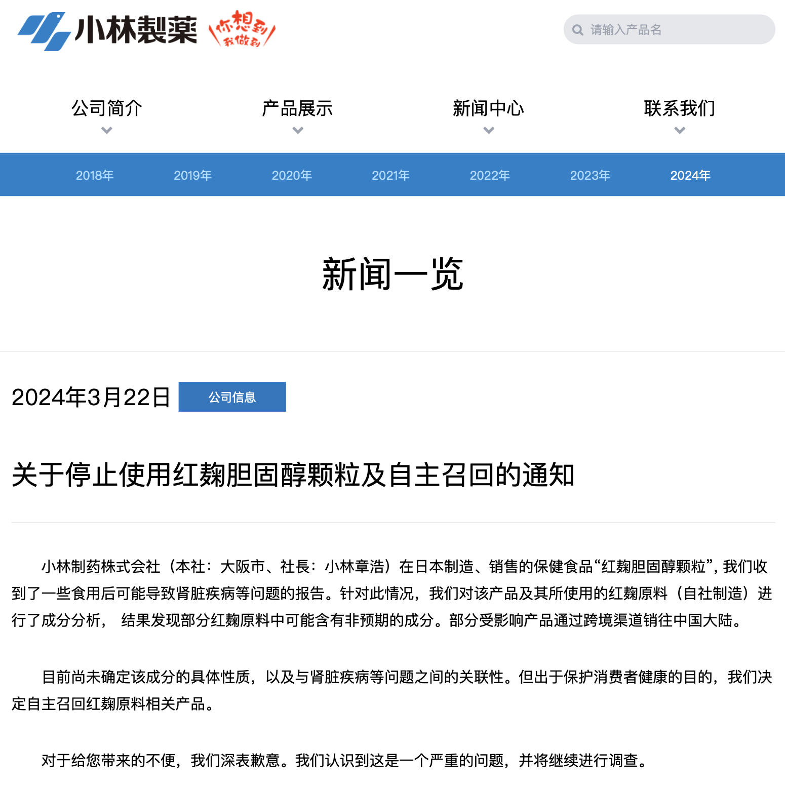 3月26日,小林制药在官网更新此前发布的召回公告称,接到一位因肾脏疾病去世的消费者家属消息,该逝者曾在生前使用该公司生产的含红曲成分保健品。公司确认,该消费者曾在2021年4月至2024年2月间通过邮购的方式购买了上述产品,公司正在积极确认该死亡事件是否与公司所生产的含红曲成分保健品存在因果关系。