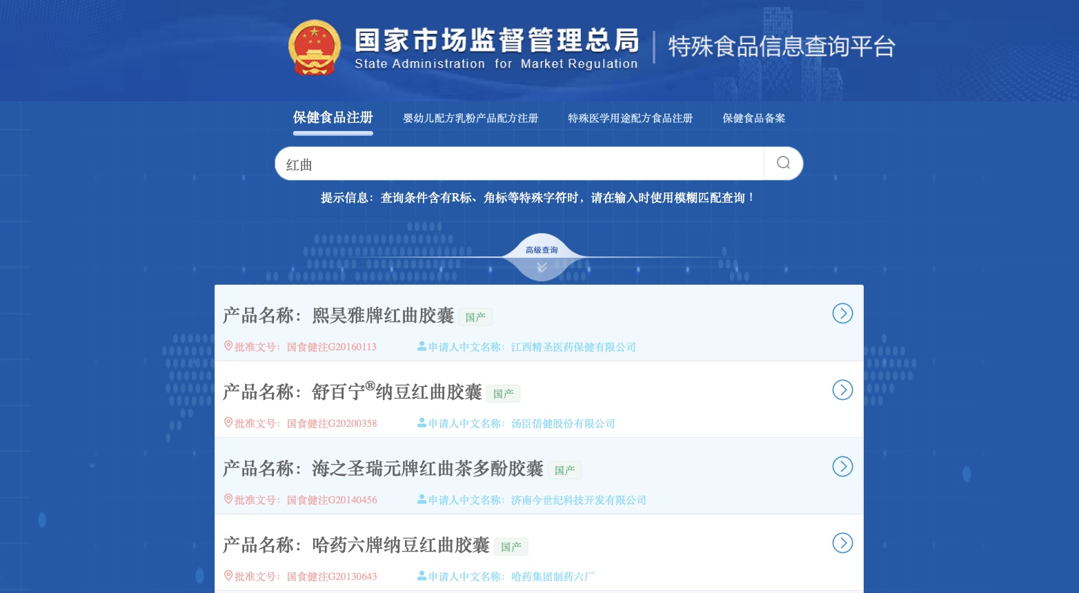 南方+记者查询发现,目前国家市场监督管理总局共有157条登记在册的红曲类相关保健食品。京都念慈庵、江中制药、汤臣倍健、同仁堂、云南白药、恒瑞医药、复星医药等国内知名药企均有红曲胶囊相关产品在售。