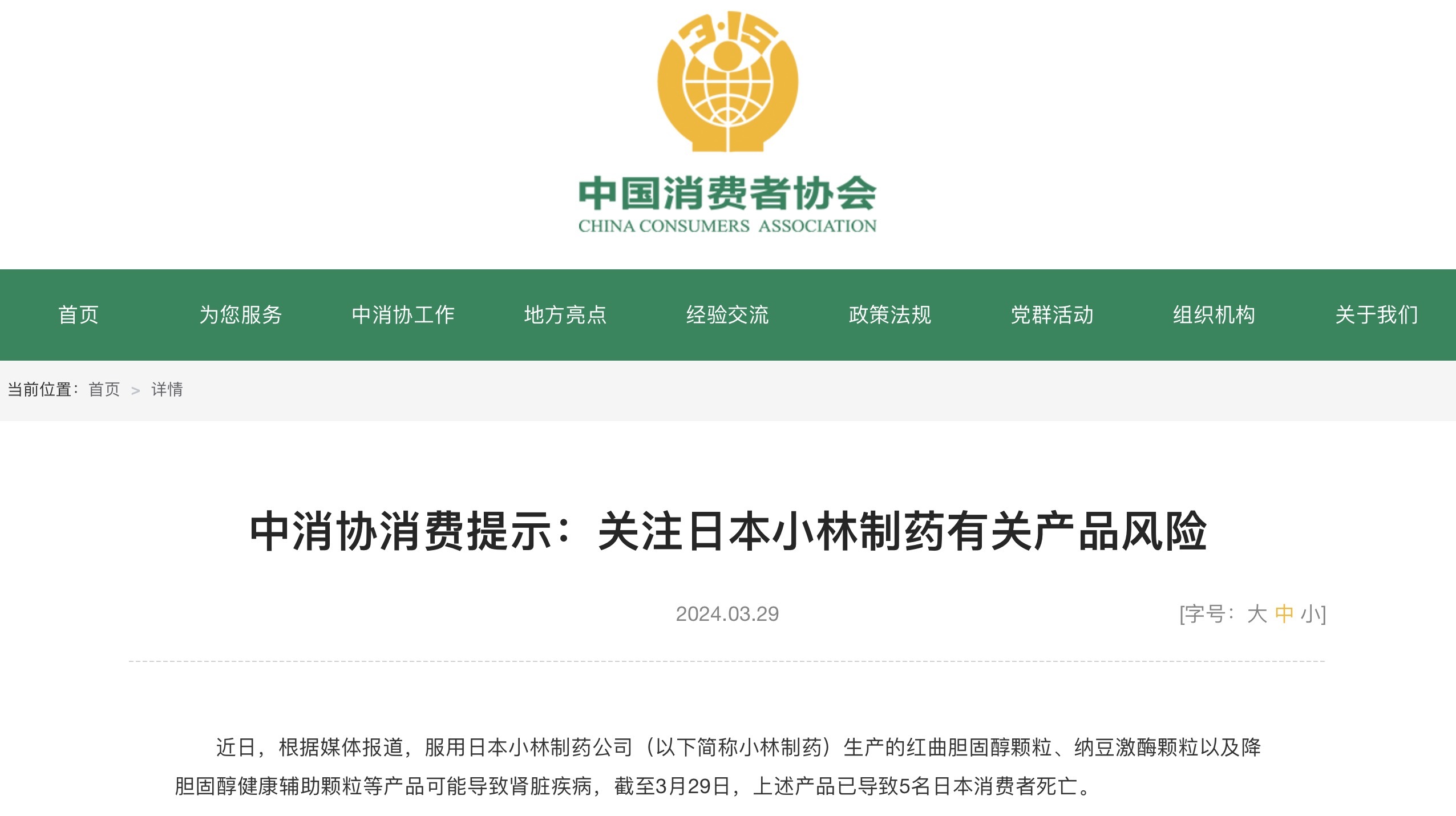 3月29日,中国消费者协会在官网发布提示,称正关注日本小林制药有关产品风险。