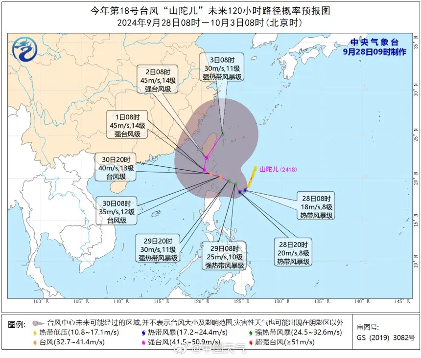 预计,“山陀儿”将以每小时5公里左右的速度缓慢向西偏南方向移动,强度逐渐加强;29日早晨以后转向北偏西方向移动,并逐渐向台湾岛东南部海面靠近,随后继续偏北行,强度还将继续增强。