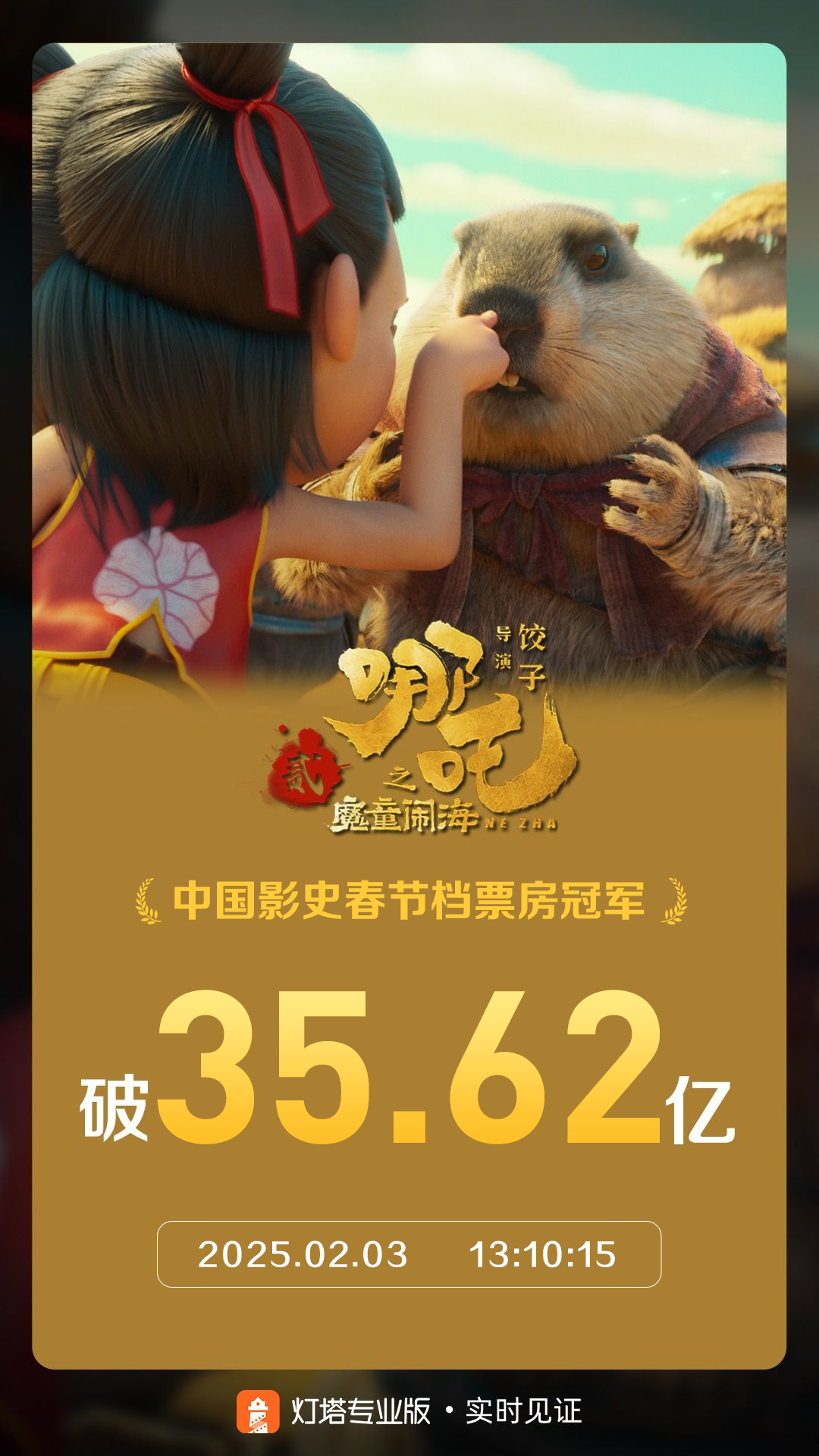 据灯塔专业版,截至2月3日13时15分,《哪吒之魔童闹海》票房已达35.62亿元,超过《唐人街探案3》(2021年春节档档期内票房35.61亿元),成为中国影史春节档票房冠军。