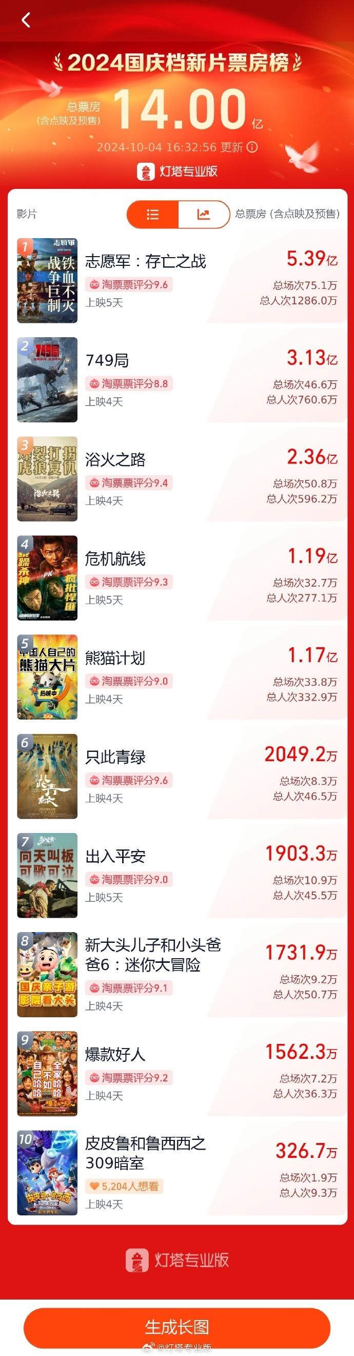 据灯塔专业版,截至10月4日16时32分,2024年国庆档新片票房(含点映及预售)突破14亿!《志愿军:存亡之战》《749局》《浴火之路》暂列新片票房前三名。 编辑 朱琦 订阅后可查看全文(剩余80%)