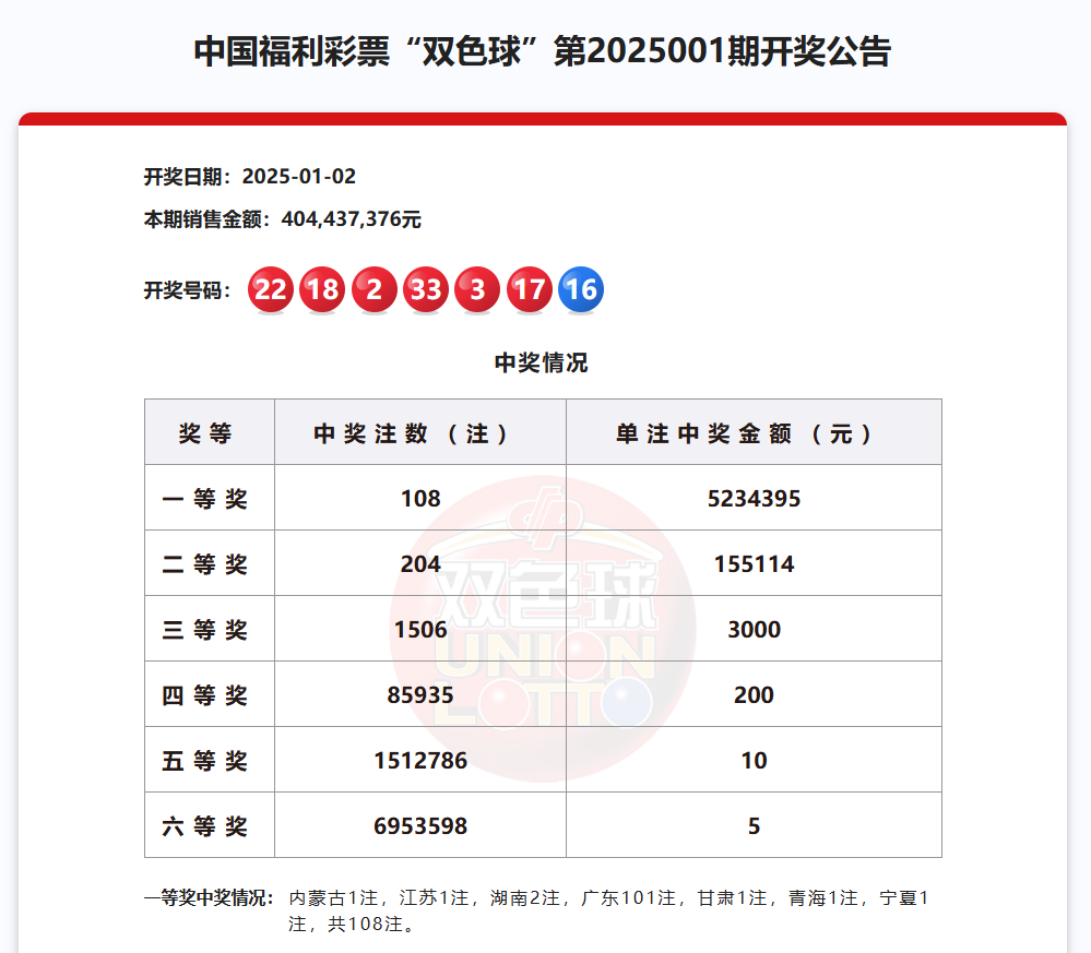 双色球2025年首期一等奖中奖情况是内蒙古1注,江苏1注,湖南2注,广东101注,甘肃1注,青海1注,宁夏1注,共108注。