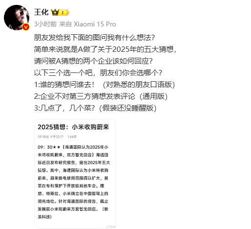 王化表示,“A做了关于2025年的五大猜想,请问被A猜想的两个企业该如何回应?以下三个选一个吧,朋友们你会选哪个?1:谁的猜想问谁去!(对熟悉的朋友口语版)2:企业不对第三方猜想发表评论(通用版)3:几点了,几个菜?(假装还没睡醒版)”