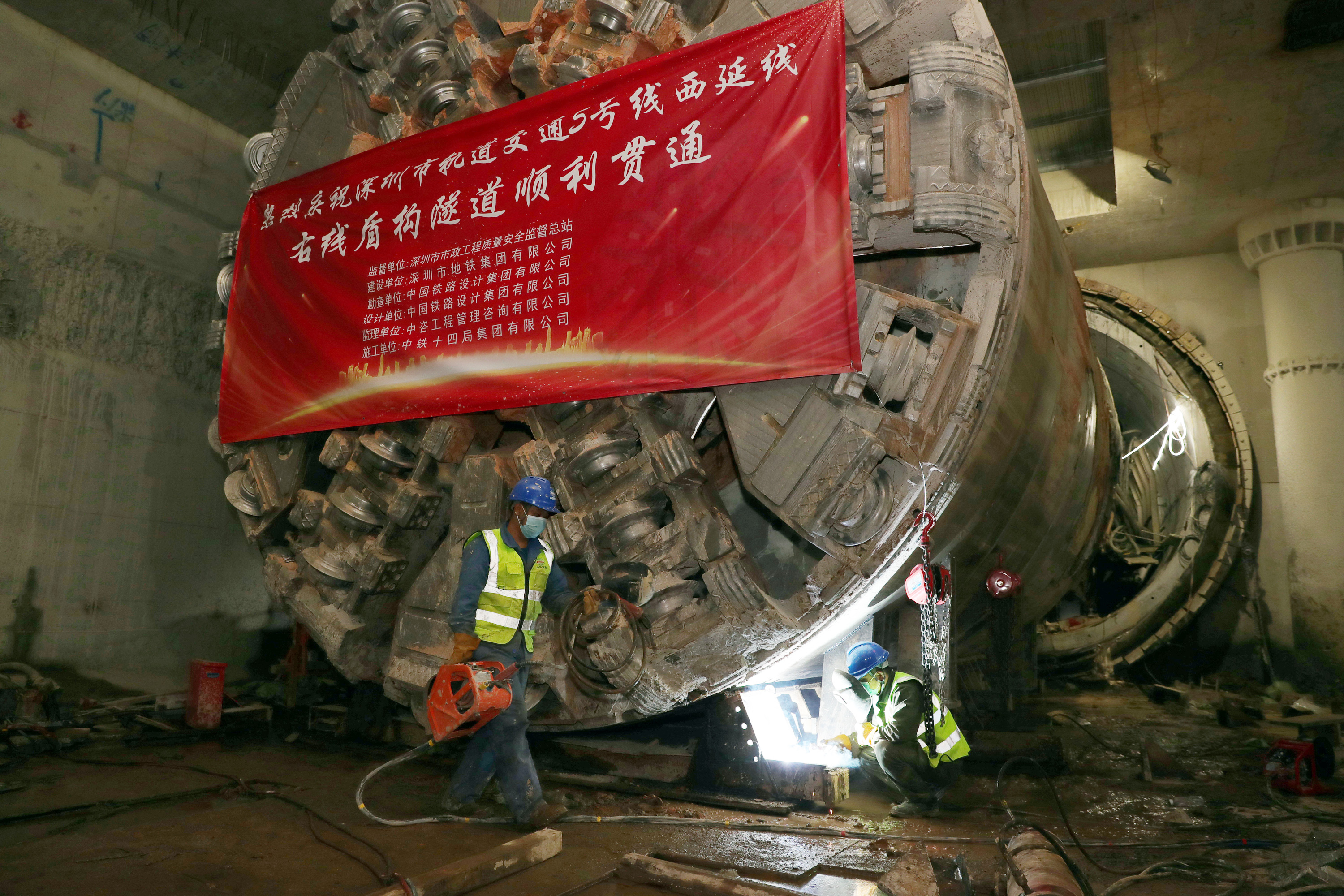 2025年2月28日,伴随着盾构机刀盘轰鸣的旋转声,“深安1号”盾构机在大剧院站破土而出,建设路站~大剧院站盾构区间左线顺利贯通,标志着中铁十四局集团有限公司承建的深圳地铁5号线西延盾构区间全线贯通,为深圳地铁5号线西延顺利通车奠定坚实的基础。