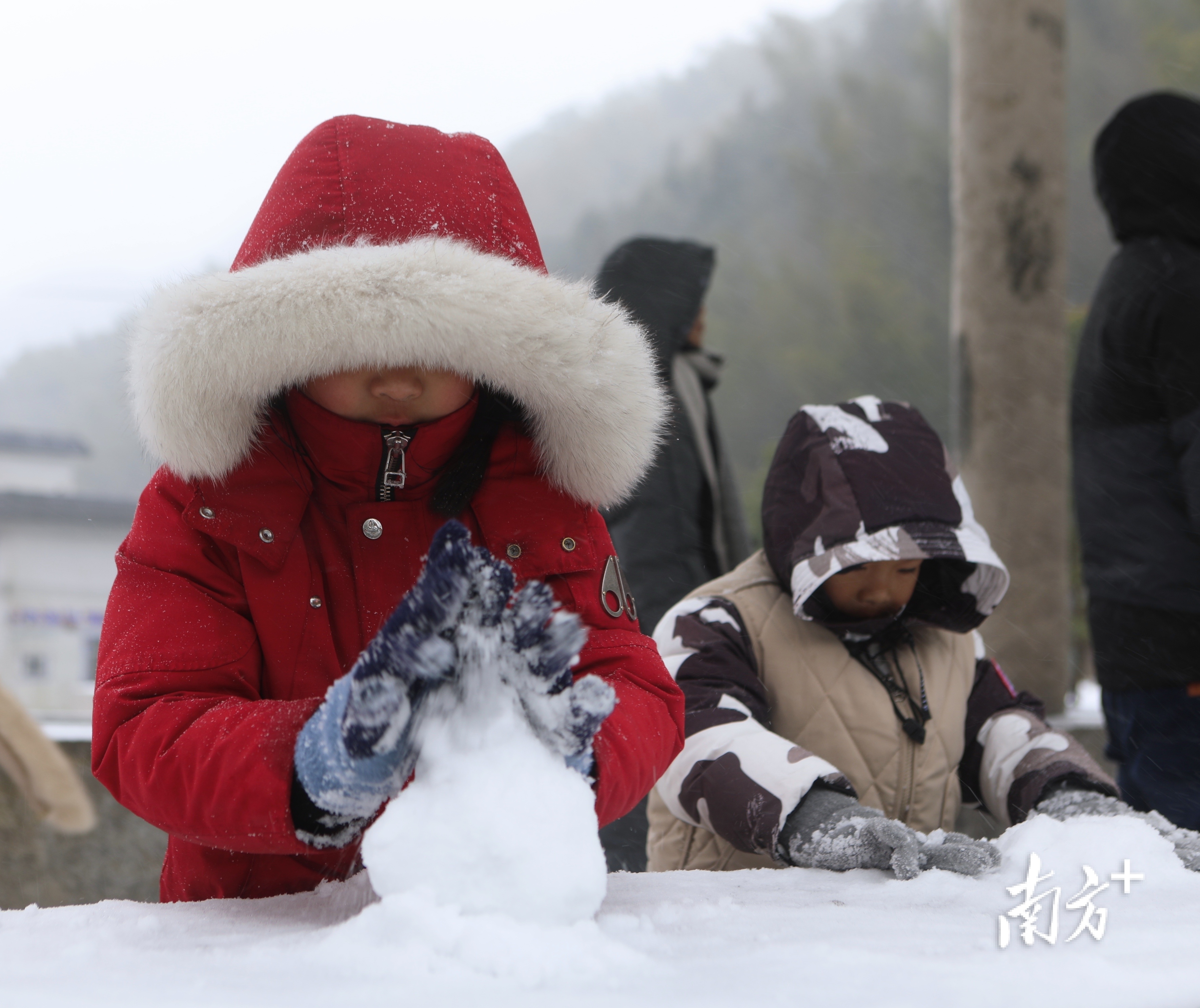 新八村的村民告诉南方+记者,当地22日凌晨开始下雪,早上起床后看到村里的道路和屋顶上已经全白了。雪天给孩子们带来一片天然的乐园。孩子们在雪地中尽情玩耍。