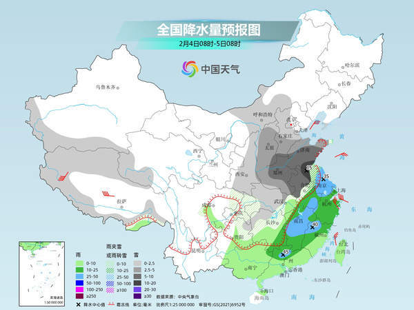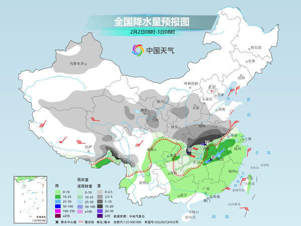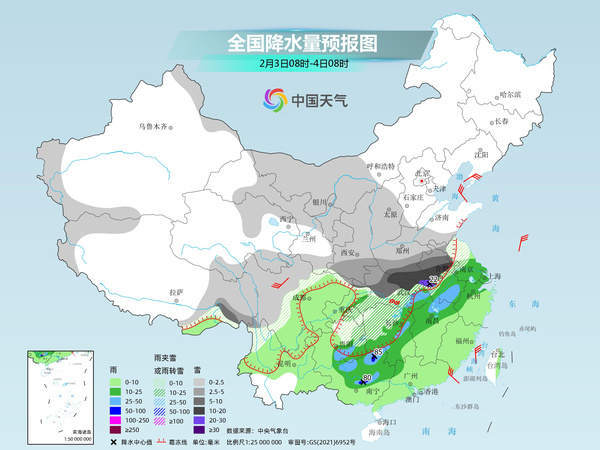 未来三天(2月2日至4日),中东部大范围雨雪冰冻天气过程进入鼎盛时段,江汉至黄淮一带将遭遇强降雪,局地或现大暴雪,江南、华南局地有暴雨,并可能出现强对流天气。在冷空气和雨雪天气共同影响下,中东部多地湿冷感明显。春运高峰期将至,公众需注意出行安全,做好防寒保暖措施。
