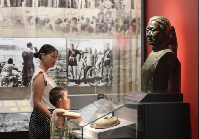 2015年7月12日,《伟大胜利 历史贡献》主题展览上,观众在观看“英雄母亲”邓玉芬的事迹。新华社记者 罗晓光 摄