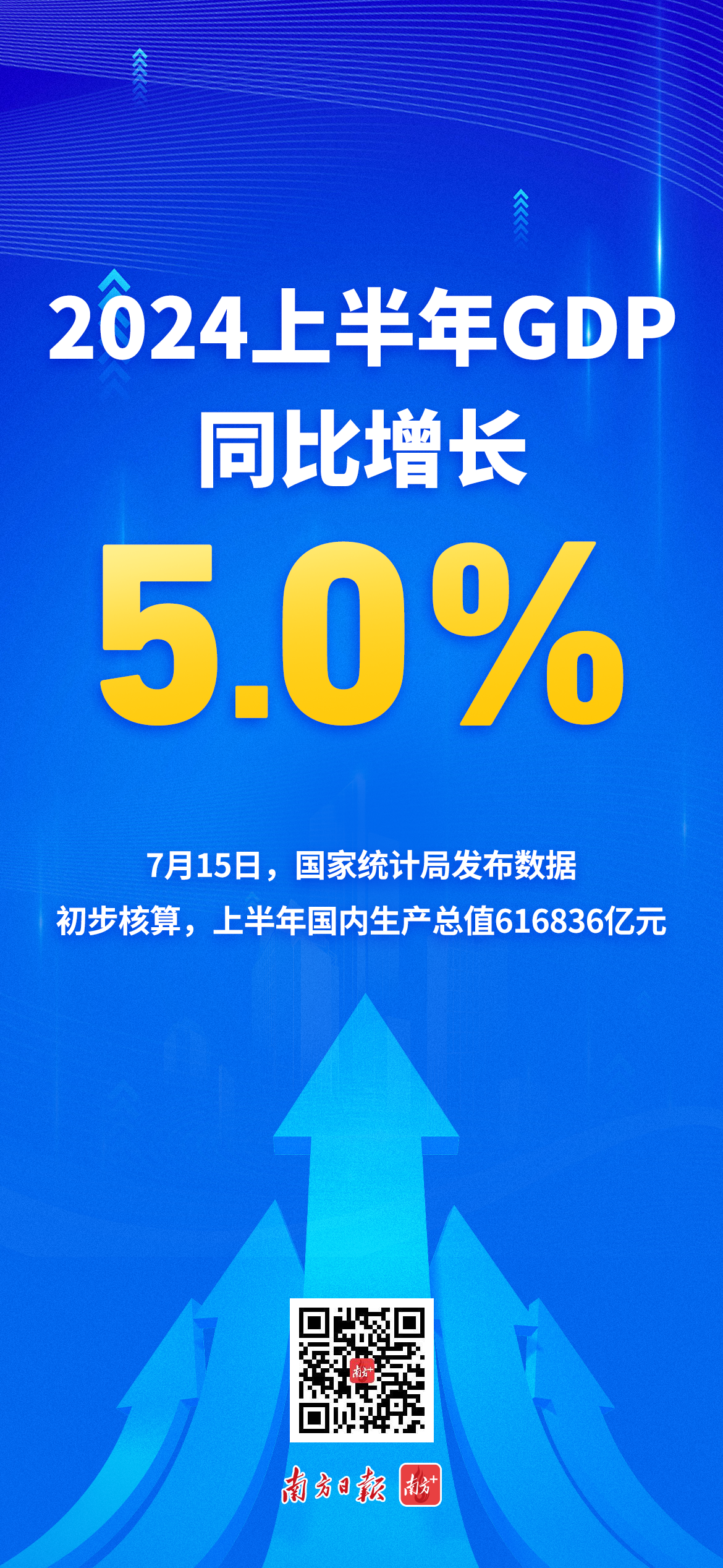 7月15日,国家统计局发布数据,初步核算,上半年国内生产总值616836亿元,按不变价格计算,同比增长5.0%。