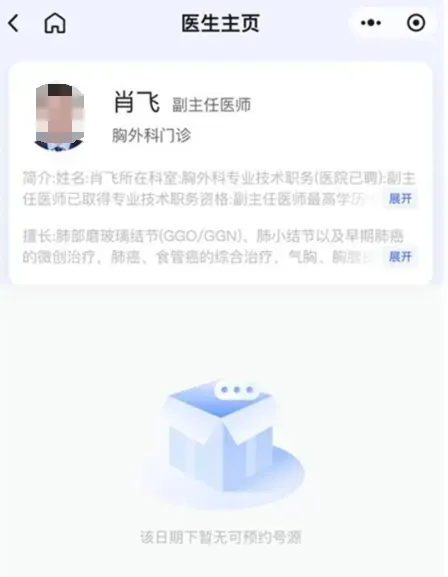 4月27日晚,记者注意到,中日友好医院官网仍有肖某的个人资料。记者登录该医院的微信小程序,仍能搜到肖某的个人信息,但预约挂号系统显示,其名下已无可预约号源。