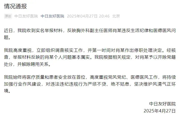 4月27日,中日友好医院发布情况通报:近日,我院收到实名举报材料,反映胸外科副主任医师肖某违反生活纪律和医德医风问题。