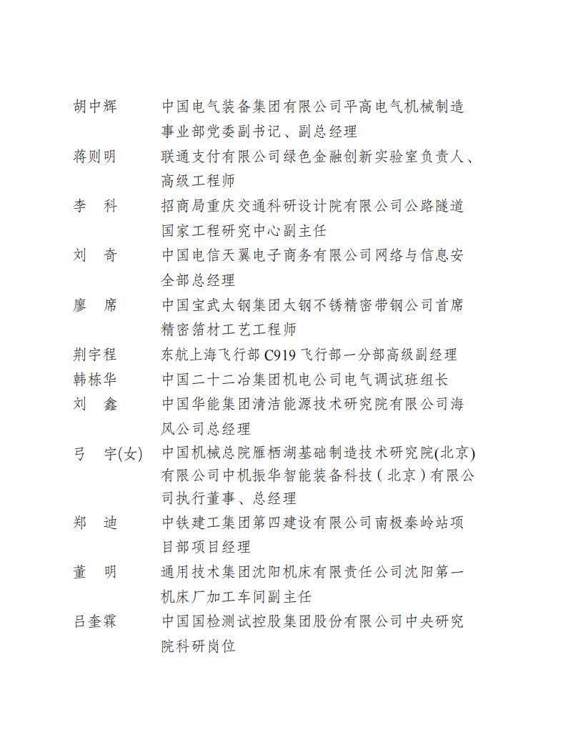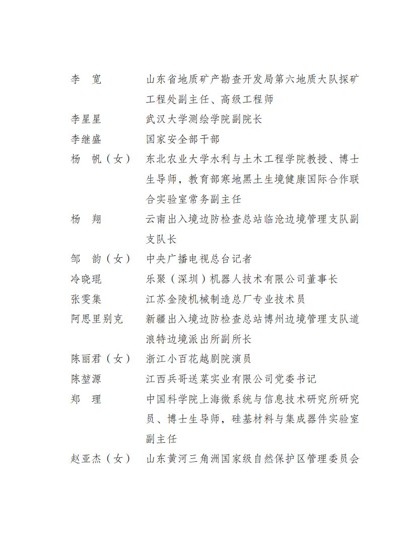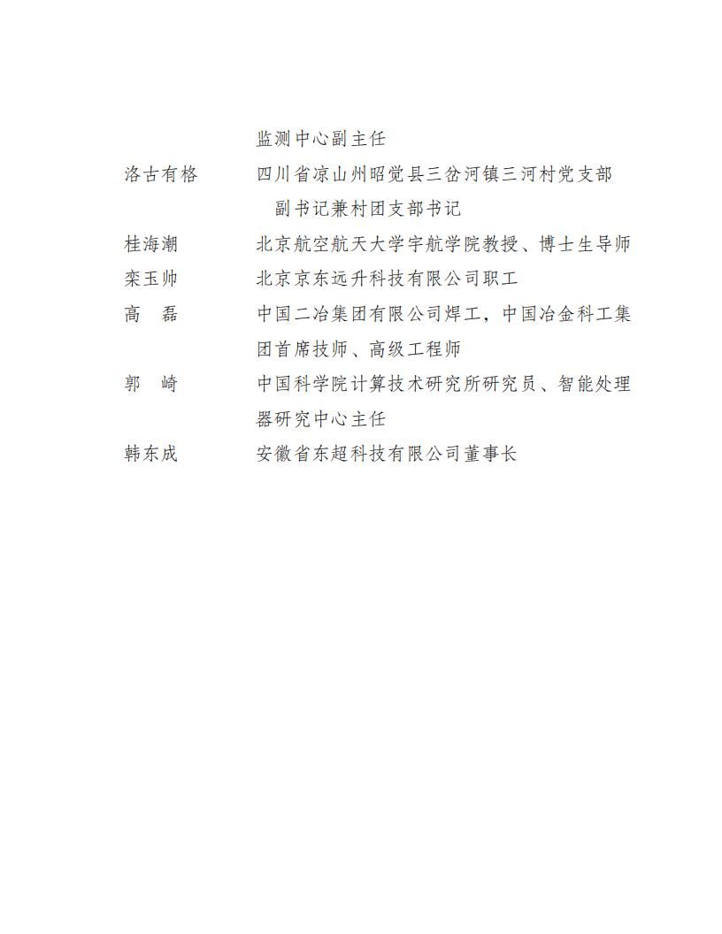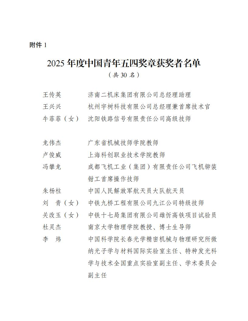 荣获2025年度中国青年五四奖章的分别是:济南二机床集团有限公司总经理助理王传英,杭州宇树科技有限公司总经理兼首席技术官王兴兴,沈阳铁路信号有限责任公司高级技师牛菲菲(女),广东省机械技师学院教师龙伟杰,上海科创职业技术学院教师卢俊威,成都飞机工业(集团)有限责任公司飞机铆装钳工首席操作技师冯攀龙,中国人民解放军航天员大队航天员朱杨柱,中铁九桥工程有限公司九江公司特级技师刘青(女),中铁十七局集团有限公司雄忻高铁项目试验员关改玉(女),南京大学物理学院教授、博士生导师杜灵杰,中国科学院长春光学精密机械与物理研究所微纳光子学与材料国际实验室主任、特种发光科学与技术全国重点实验室副主任、学术委员会副主任李炜,山东省地质矿产勘查开发局第六地质大队探矿工程处副主任、高级工程师李宽,武汉大学测绘学院副院长李星星,国家安全部干部李继盛,东北农业大学水利与土木工程学院教授、博士生导师,教育部寒地黑土生境健康国际合作联合实验室常务副主任杨帆(女),云南出入境边防检查总站临沧边境管理支队副支队长杨翔,中央广播电视总台记者邹韵(女),乐聚(深圳)机器人技术有限公司董事长冷晓琨,江苏金陵机械制造总厂专业技术员张雯集,新疆出入境边防检查总站博州边境管理支队道浪特边境派出所副所长阿思里别克,浙江小百花越剧院演员陈丽君(女),江西兵哥送菜实业有限公司党委书记陈堃源,中国科学院上海微系统与信息技术研究所研究员、博士生导师,硅基材料与集成器件实验室副主任郑理,山东黄河三角洲国家级自然保护区管理委员会监测中心副主任赵亚杰(女),四川省凉山州昭觉县三岔河镇三河村党支部副书记兼村团支部书记洛古有格,北京航空航天大学宇航学院教授、博士生导师桂海潮,北京京东远升科技有限公司职工栾玉帅,中国二冶集团有限公司焊工,中国冶金科工集团首席技师、高级工程师高磊,中国科学院计算技术研究所研究员、智能处理器研究中心主任郭崎,安徽省东超科技有限公司董事长韩东成。