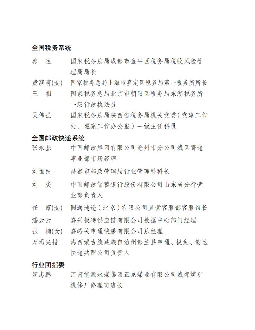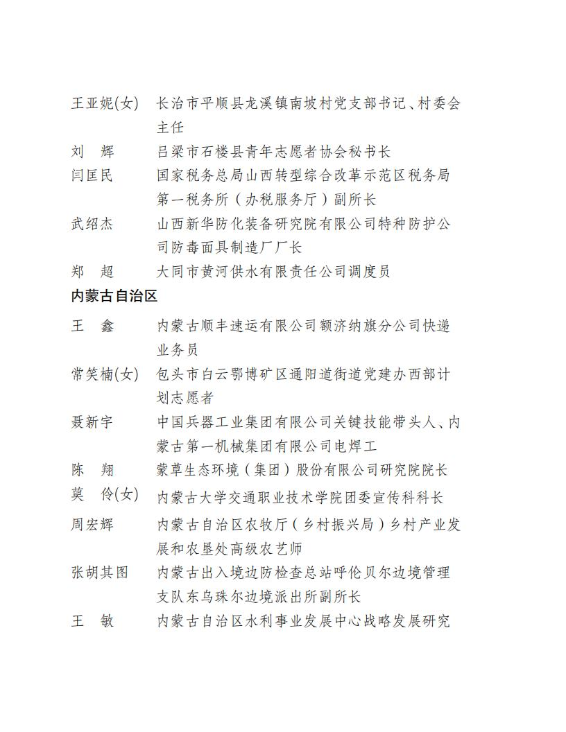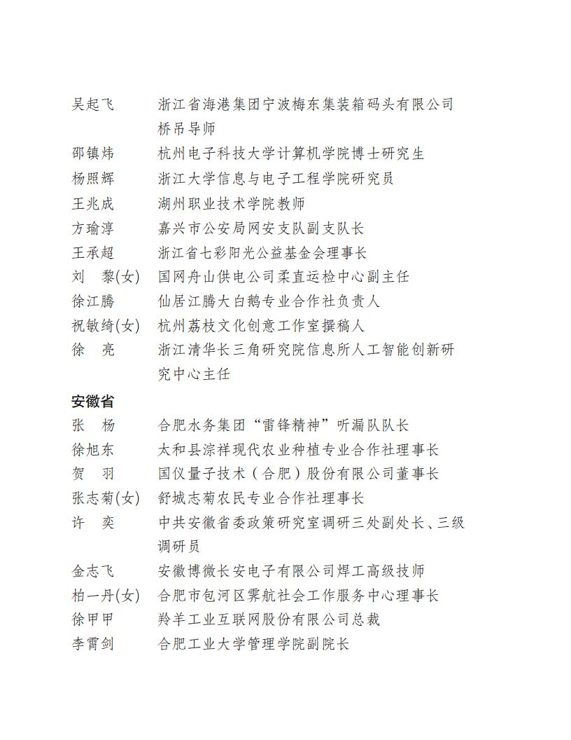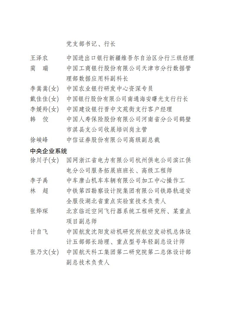 荣获2025年度中国青年五四奖章的分别是:济南二机床集团有限公司总经理助理王传英,杭州宇树科技有限公司总经理兼首席技术官王兴兴,沈阳铁路信号有限责任公司高级技师牛菲菲(女),广东省机械技师学院教师龙伟杰,上海科创职业技术学院教师卢俊威,成都飞机工业(集团)有限责任公司飞机铆装钳工首席操作技师冯攀龙,中国人民解放军航天员大队航天员朱杨柱,中铁九桥工程有限公司九江公司特级技师刘青(女),中铁十七局集团有限公司雄忻高铁项目试验员关改玉(女),南京大学物理学院教授、博士生导师杜灵杰,中国科学院长春光学精密机械与物理研究所微纳光子学与材料国际实验室主任、特种发光科学与技术全国重点实验室副主任、学术委员会副主任李炜,山东省地质矿产勘查开发局第六地质大队探矿工程处副主任、高级工程师李宽,武汉大学测绘学院副院长李星星,国家安全部干部李继盛,东北农业大学水利与土木工程学院教授、博士生导师,教育部寒地黑土生境健康国际合作联合实验室常务副主任杨帆(女),云南出入境边防检查总站临沧边境管理支队副支队长杨翔,中央广播电视总台记者邹韵(女),乐聚(深圳)机器人技术有限公司董事长冷晓琨,江苏金陵机械制造总厂专业技术员张雯集,新疆出入境边防检查总站博州边境管理支队道浪特边境派出所副所长阿思里别克,浙江小百花越剧院演员陈丽君(女),江西兵哥送菜实业有限公司党委书记陈堃源,中国科学院上海微系统与信息技术研究所研究员、博士生导师,硅基材料与集成器件实验室副主任郑理,山东黄河三角洲国家级自然保护区管理委员会监测中心副主任赵亚杰(女),四川省凉山州昭觉县三岔河镇三河村党支部副书记兼村团支部书记洛古有格,北京航空航天大学宇航学院教授、博士生导师桂海潮,北京京东远升科技有限公司职工栾玉帅,中国二冶集团有限公司焊工,中国冶金科工集团首席技师、高级工程师高磊,中国科学院计算技术研究所研究员、智能处理器研究中心主任郭崎,安徽省东超科技有限公司董事长韩东成。