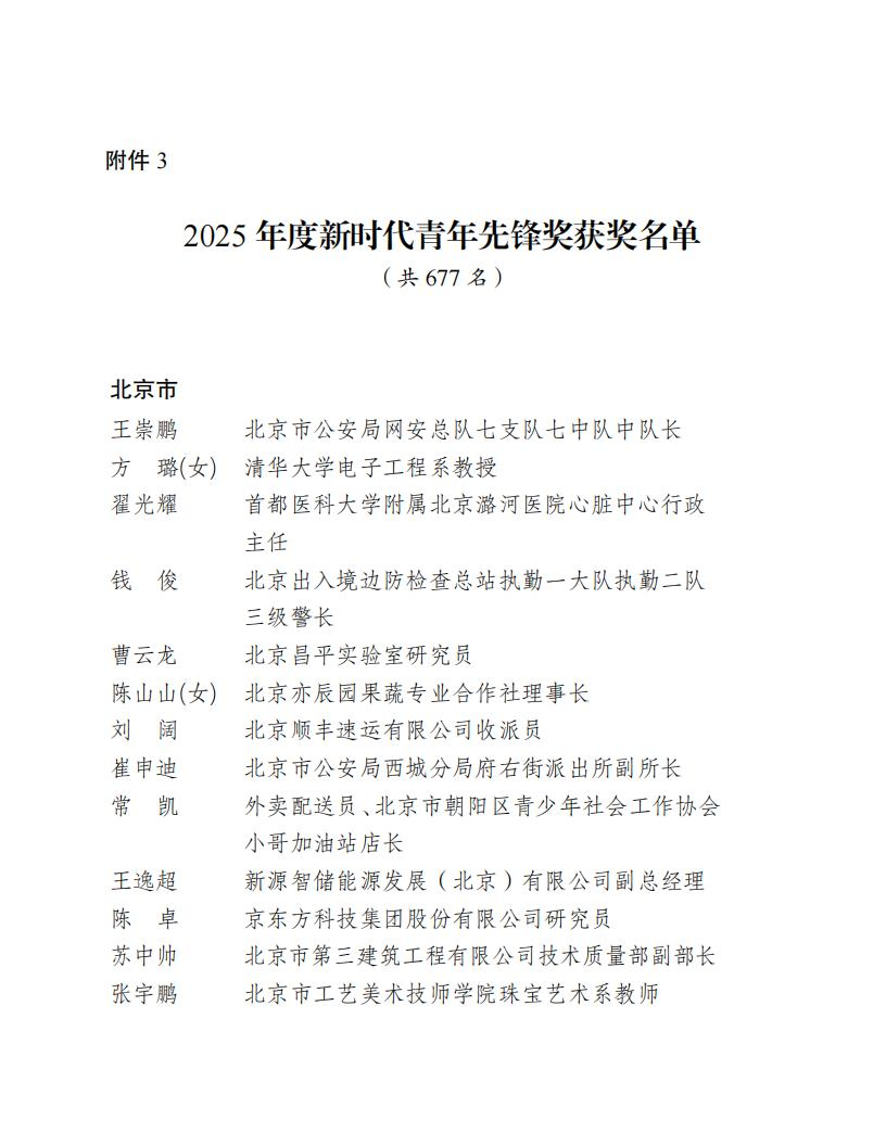 新华社北京4月30日电 为表彰我国优秀青年在推进中国式现代化中的贡献,集中展示新时代青年的精神品格和价值追求,激励引导全国广大青年积极投身强国建设、民族复兴伟业,共青团中央、全国青联决定,授予王传英等30名同志2025年度中国青年五四奖章,授予新疆克州阿图什市哈拉峻乡谢依特小学戍边支教西部计划志愿者服务队等30个青年集体2025年度中国青年五四奖章集体,授予王崇鹏等677名同志2025年度新时代青年先锋奖。