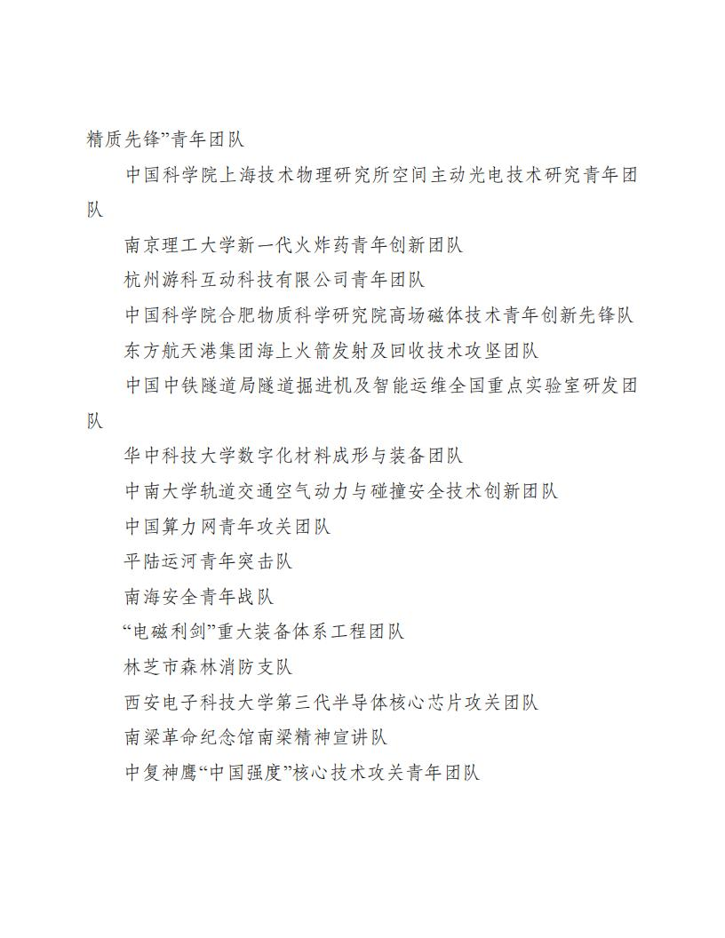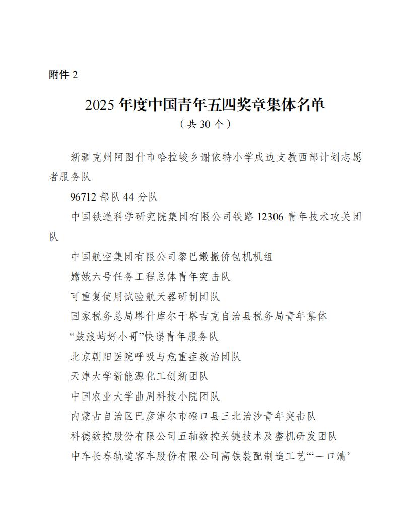 荣获2025年度中国青年五四奖章集体的分别是:新疆克州阿图什市哈拉峻乡谢依特小学戍边支教西部计划志愿者服务队,96712部队44分队,中国铁道科学研究院集团有限公司铁路12306青年技术攻关团队,中国航空集团有限公司黎巴嫩撤侨包机机组,嫦娥六号任务工程总体青年突击队,可重复使用试验航天器研制团队,国家税务总局塔什库尔干塔吉克自治县税务局青年集体,“鼓浪屿好小哥”快递青年服务队,北京朝阳医院呼吸与危重症救治团队,天津大学新能源化工创新团队,中国农业大学曲周科技小院团队,内蒙古自治区巴彦淖尔市磴口县三北治沙青年突击队,科德数控股份有限公司五轴数控关键技术及整机研发团队,中车长春轨道客车股份有限公司高铁装配制造工艺“‘一口清’精质先锋”青年团队,中国科学院上海技术物理研究所空间主动光电技术研究青年团队,南京理工大学新一代火炸药青年创新团队,杭州游科互动科技有限公司青年团队,中国科学院合肥物质科学研究院高场磁体技术青年创新先锋队,东方航天港集团海上火箭发射及回收技术攻坚团队,中国中铁隧道局隧道掘进机及智能运维全国重点实验室研发团队,华中科技大学数字化材料成形与装备团队,中南大学轨道交通空气动力与碰撞安全技术创新团队,中国算力网青年攻关团队,平陆运河青年突击队,南海安全青年战队,“电磁利剑”重大装备体系工程团队,林芝市森林消防支队,西安电子科技大学第三代半导体核心芯片攻关团队,南梁革命纪念馆南梁精神宣讲队,中复神鹰“中国强度”核心技术攻关青年团队。