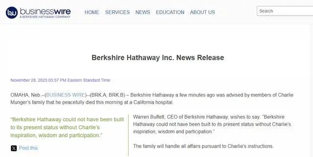 当地时间周二(11月28日),伯克希尔-哈撒韦在其子公司美国商业资讯网站上发布声明表示,董事会副主席查理·芒格(Charlie Munger)的家人几分钟前告知公司,芒格于当天早上在加州的一家医院中安详去世,享年99岁。距离其100岁生日仅有1个多月。