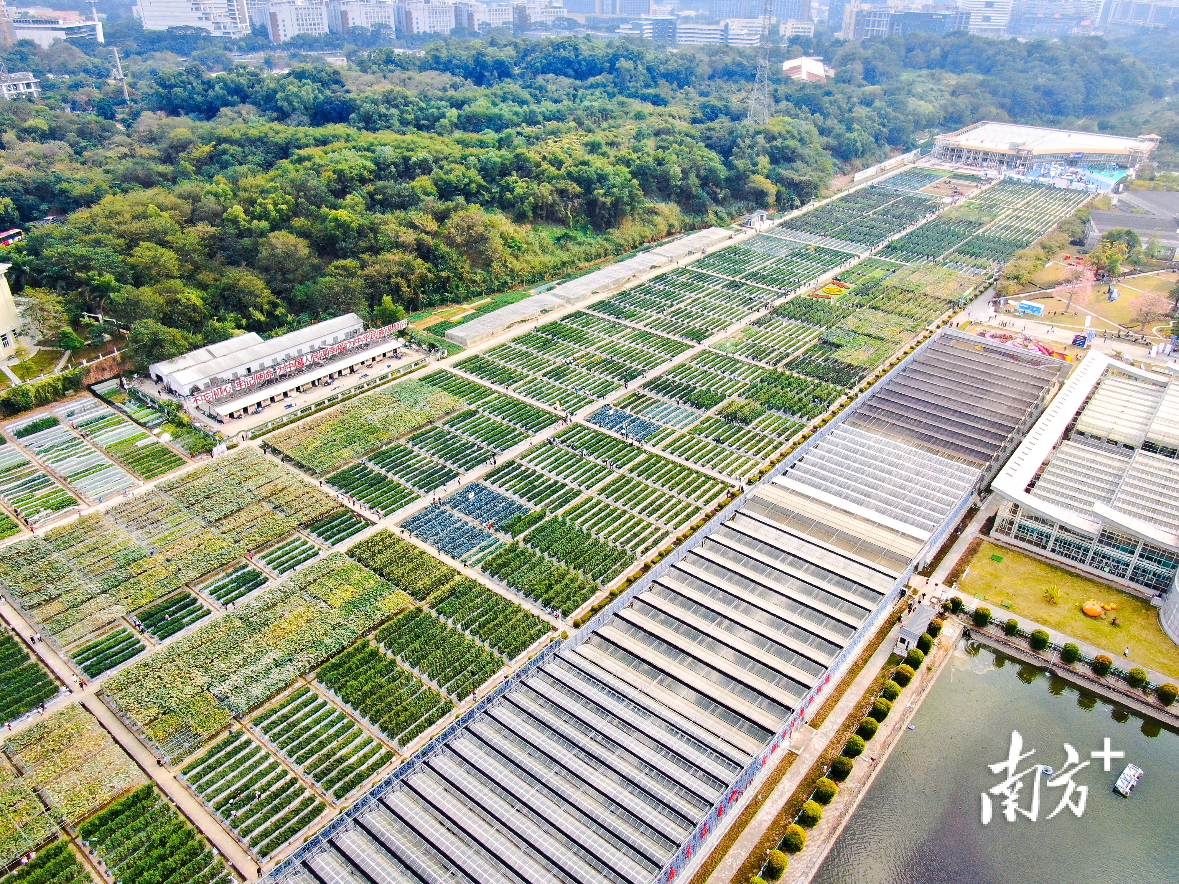高空俯瞰广州柯木塱,大片耀眼的绿色现于眼前,那便是广东种业大会举办的地方。
