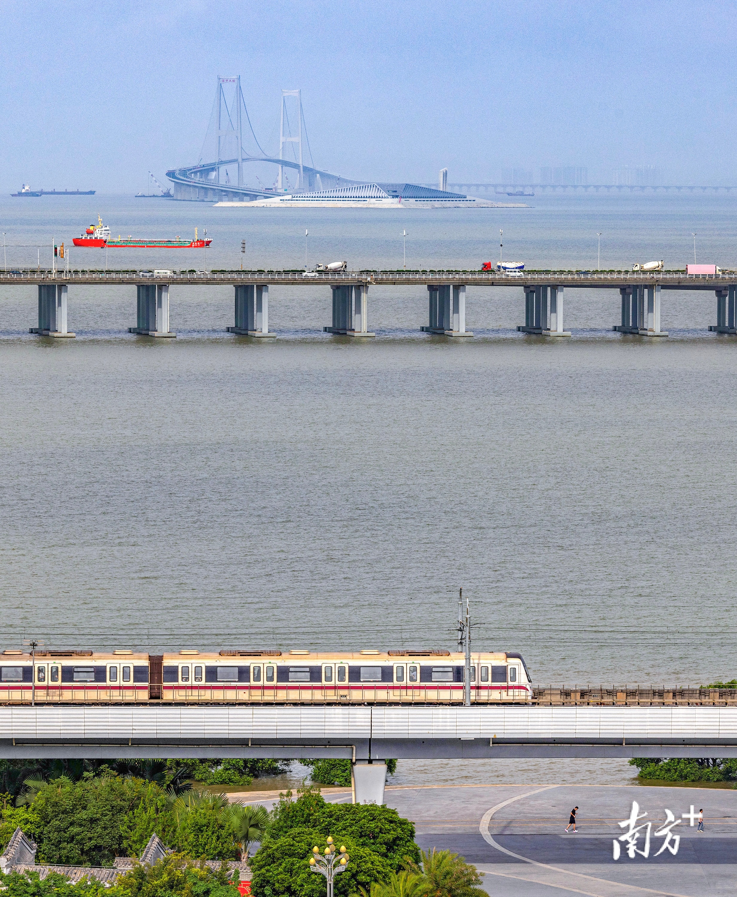 飞机呼啸而过,地铁穿城而行,深中通道两岸立体交通的繁忙图景,涌现粤港澳大湾区的无限活力。