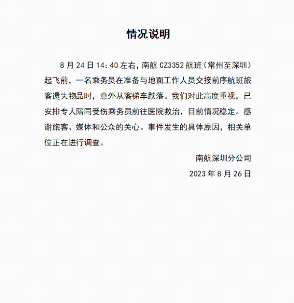 8月26日,南航深圳分公司发布《情况说明》称,乘务员在准备与地面工作人员交接前序航班旅客遗失物品时,意外从客梯车跌落。目前情况稳定。全文如下: