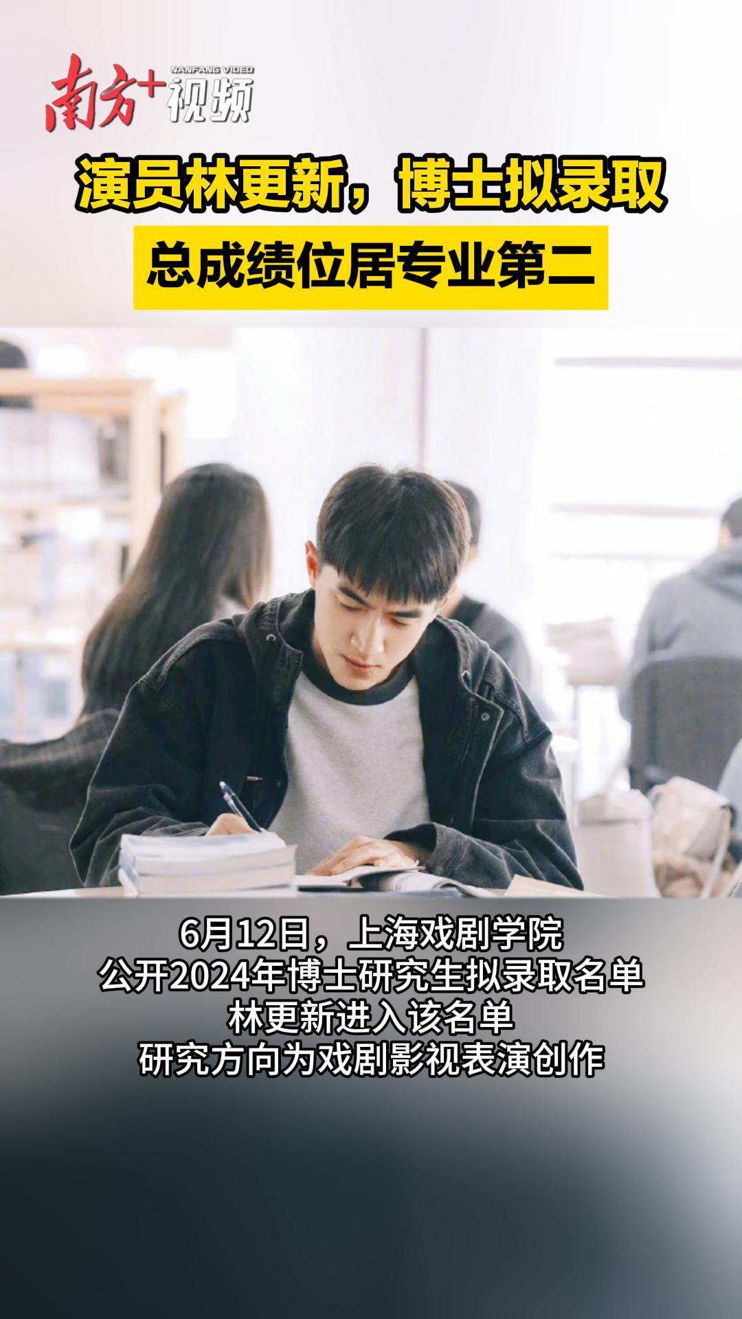 上海戏剧学院博士研究生拟录取名单显示,林更新申请的是专业学位,研究方向戏剧影视表演创作共录取4人,其中林更新以总成绩277.05分位居第二。