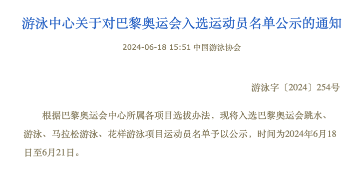 6月18日下午,国家体育总局游泳中心公示入选巴黎奥运会跳水、游泳、马拉松游泳、花样游泳项目运动员名单。