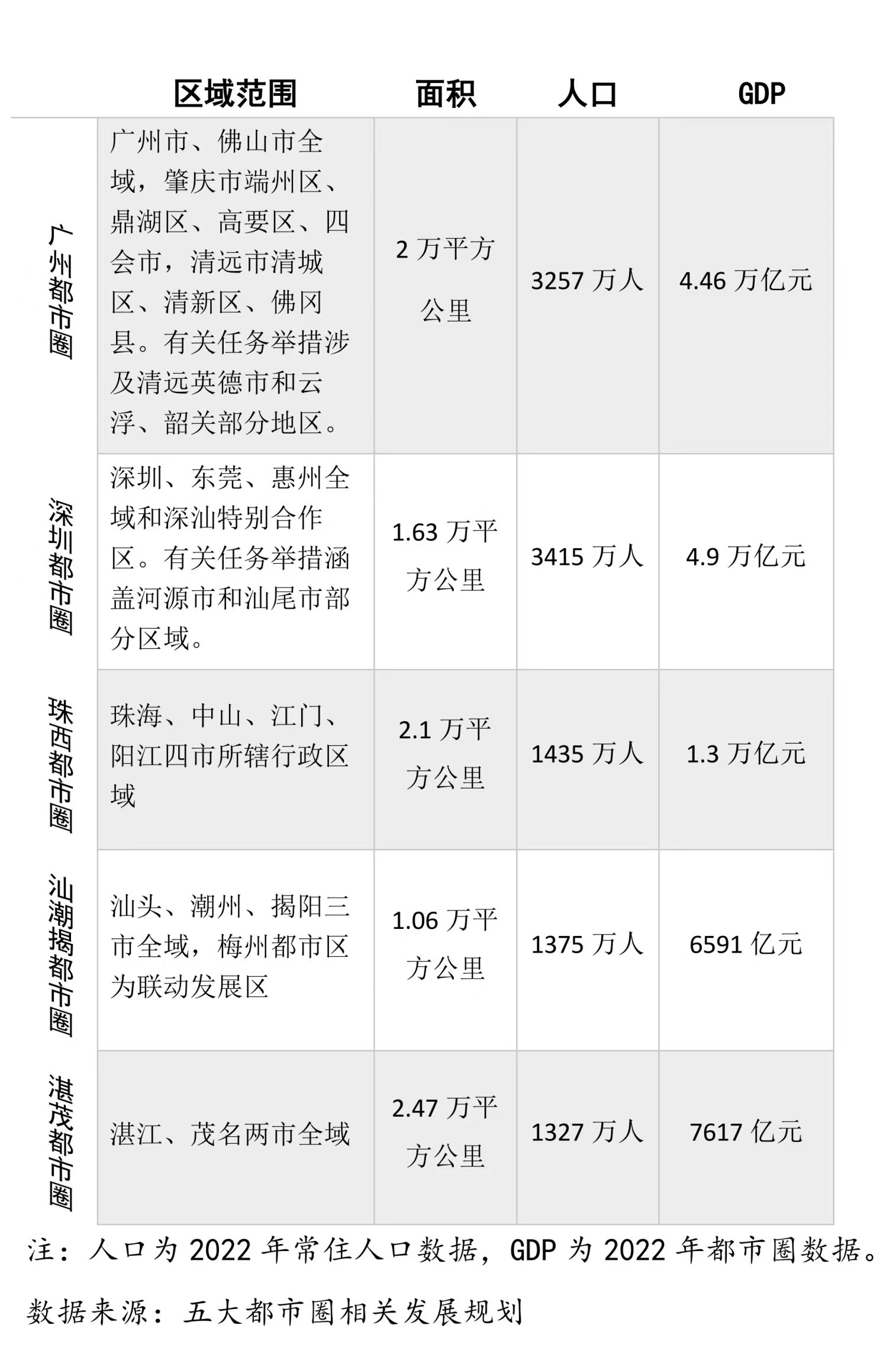 从下面这张图,我们可以看出五大都市圈的基本信息: