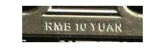 在硬币正面面额数字“10”的底端,可观察到“RMB10YUAN”的微缩文字。防伪特征效果见图4。