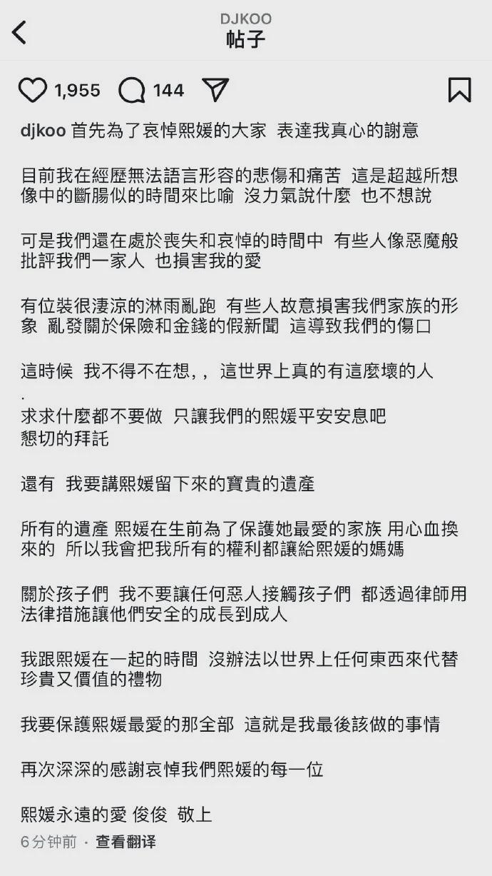 2月6日晚,具俊晔发长文,斥责装凄凉淋雨乱跑和乱发保险、金钱相关假新闻的人。他表示大S所有的遗产是熙媛在生前为了保护她最爱的家人用心血换来的,他会把所有继承遗产的权利让给大S的妈妈。关于孩子,他不让任何恶人接触,会通过律师用法律措施让他们长大成人。“我要保护徐熙媛最爱的全部,这就是我最后该做的事情。”