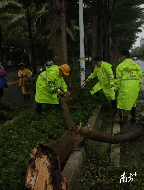 “接到霞山区人民大道北车主报案,车辆被台风吹倒的树木砸中,立即前往救援。”9月7日0时30分左右,台风登陆2个多小时,中华财险湛江中心支公司党委书记、总经理王剑带上理赔员李焱、朱光达到达报案现场。