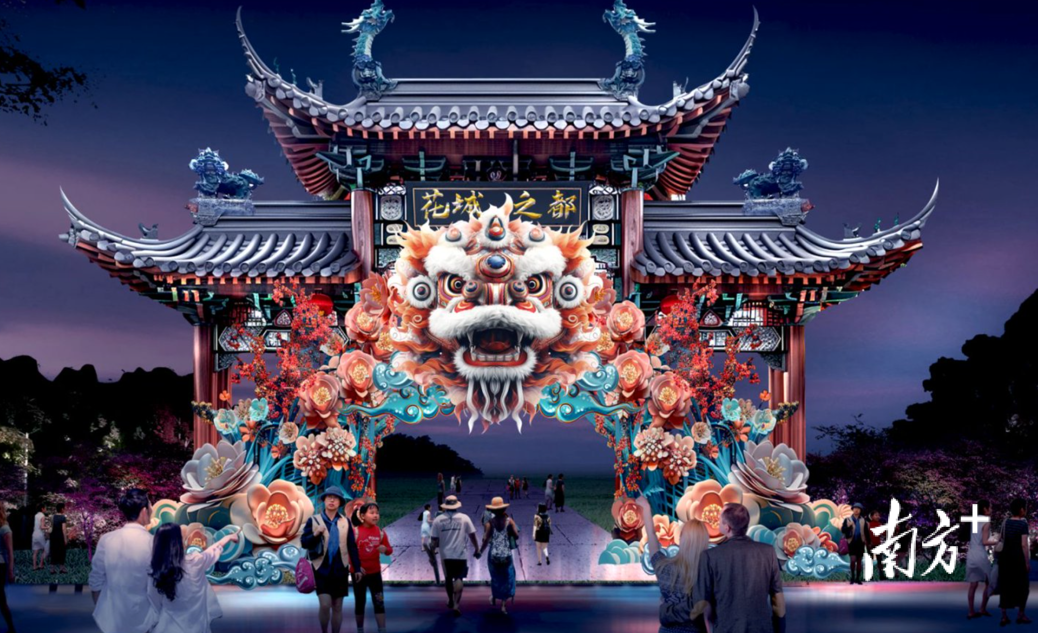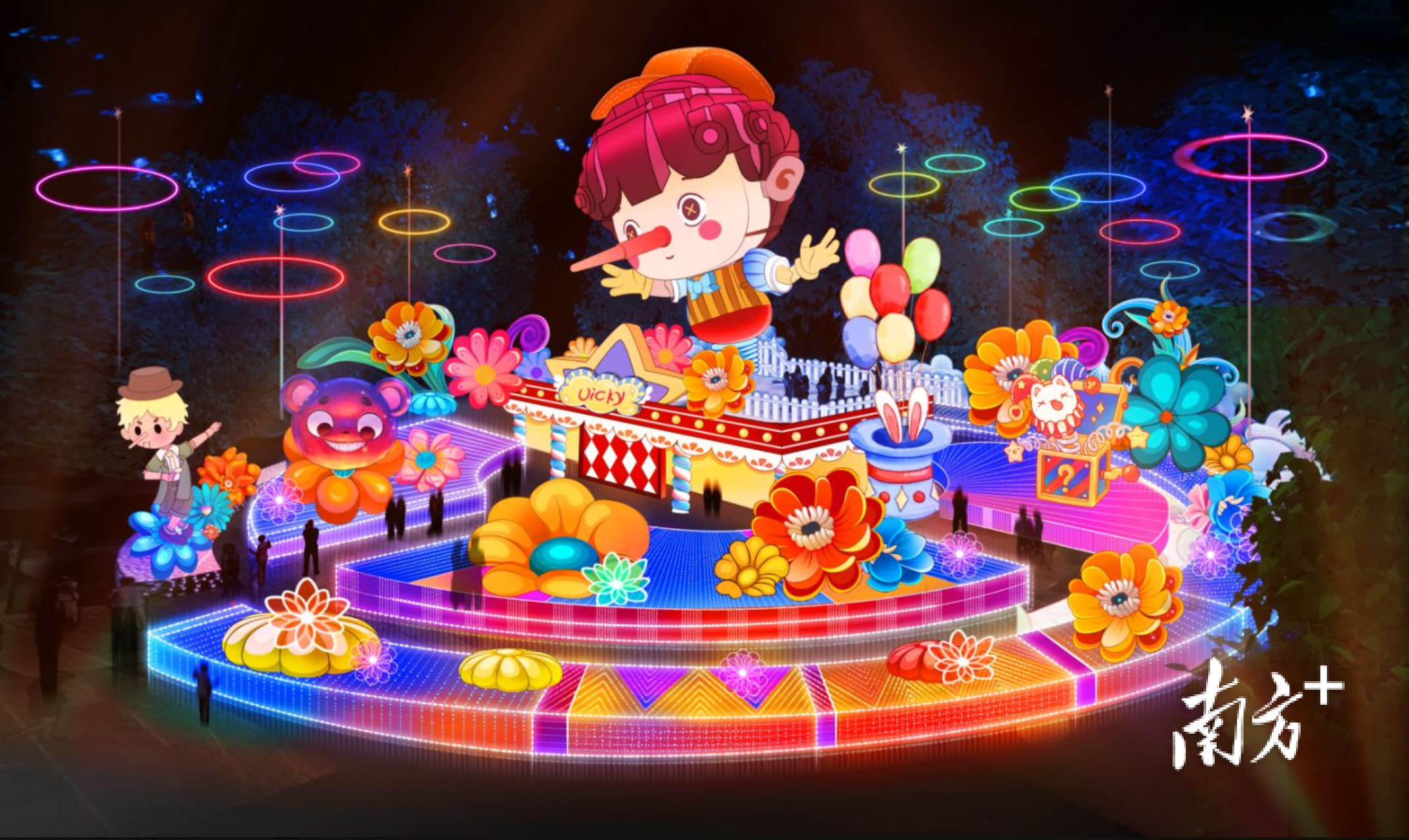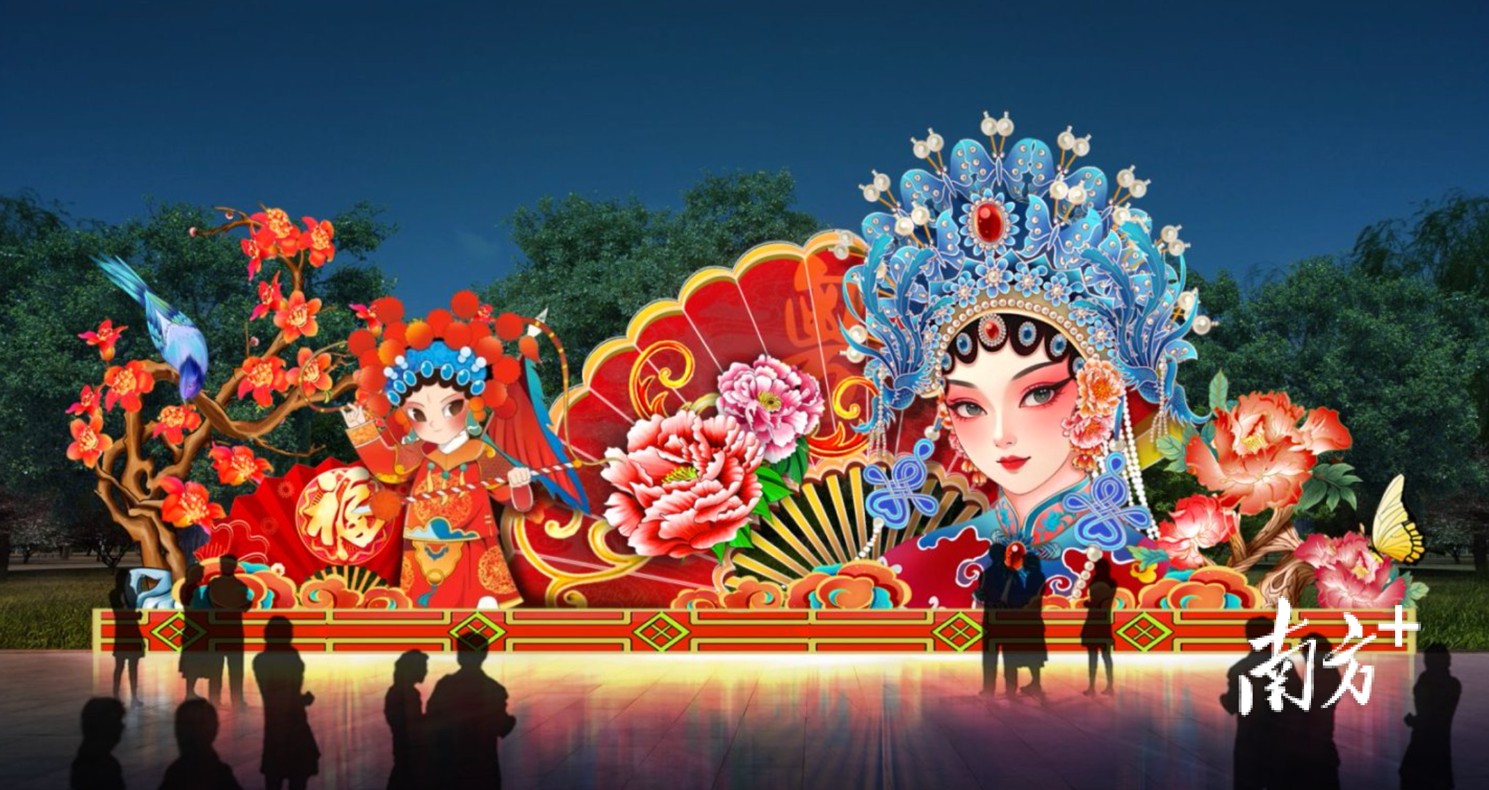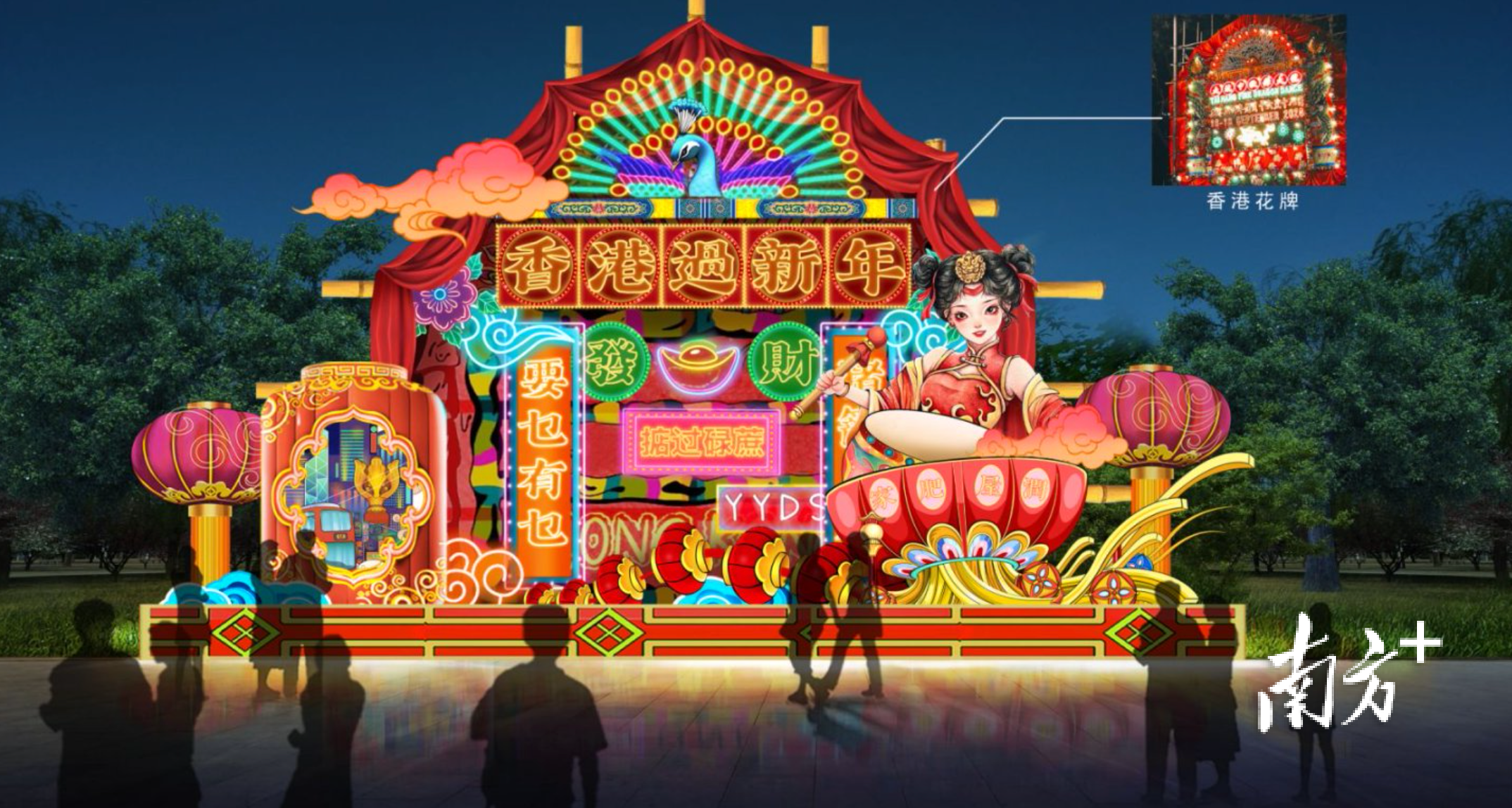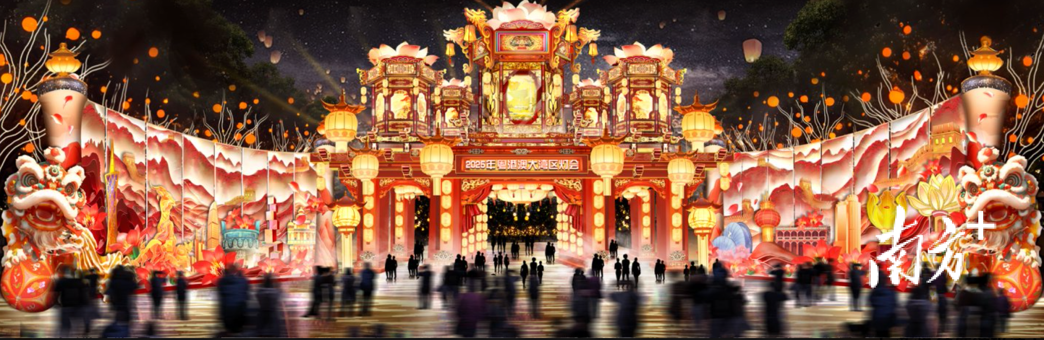 大湾区灯会以喜(禧)粤大道为轴,按“一轴五园区”,布局218组灯景,超10000盏彩灯,串联五大特色灯会园区。
