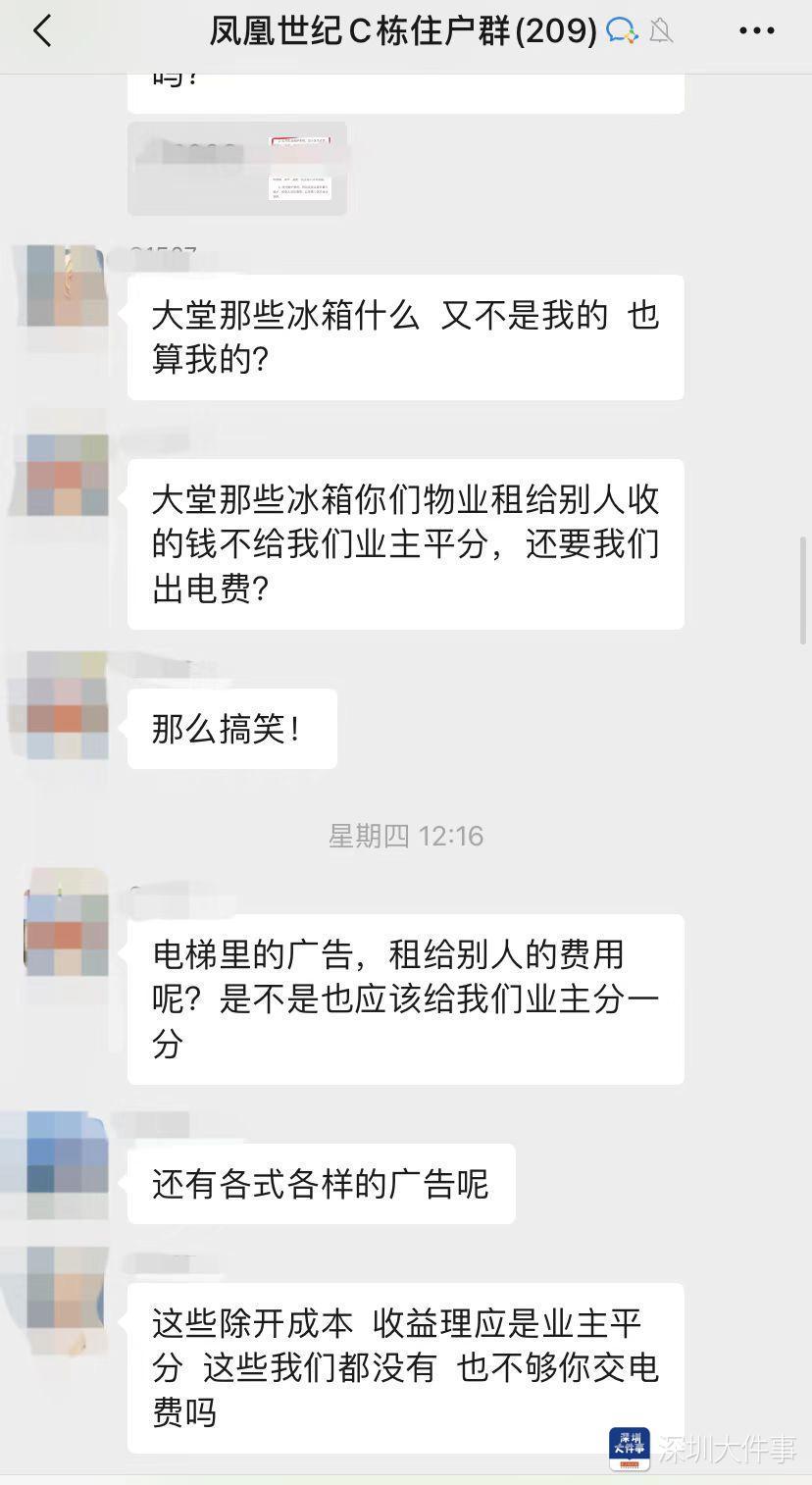 此公示一出,便有不少业主在群里表达了不满:“大堂那些冰箱你们物业租给别人收的钱,不给我们业主平分,还要我们出电费”“电梯里的广告,租给别人的费用呢?”也有住户质疑称,除开运营成本,物业收益理应是业主平分,“这些(收益)我们都没有,也不够你们交电费吗?”