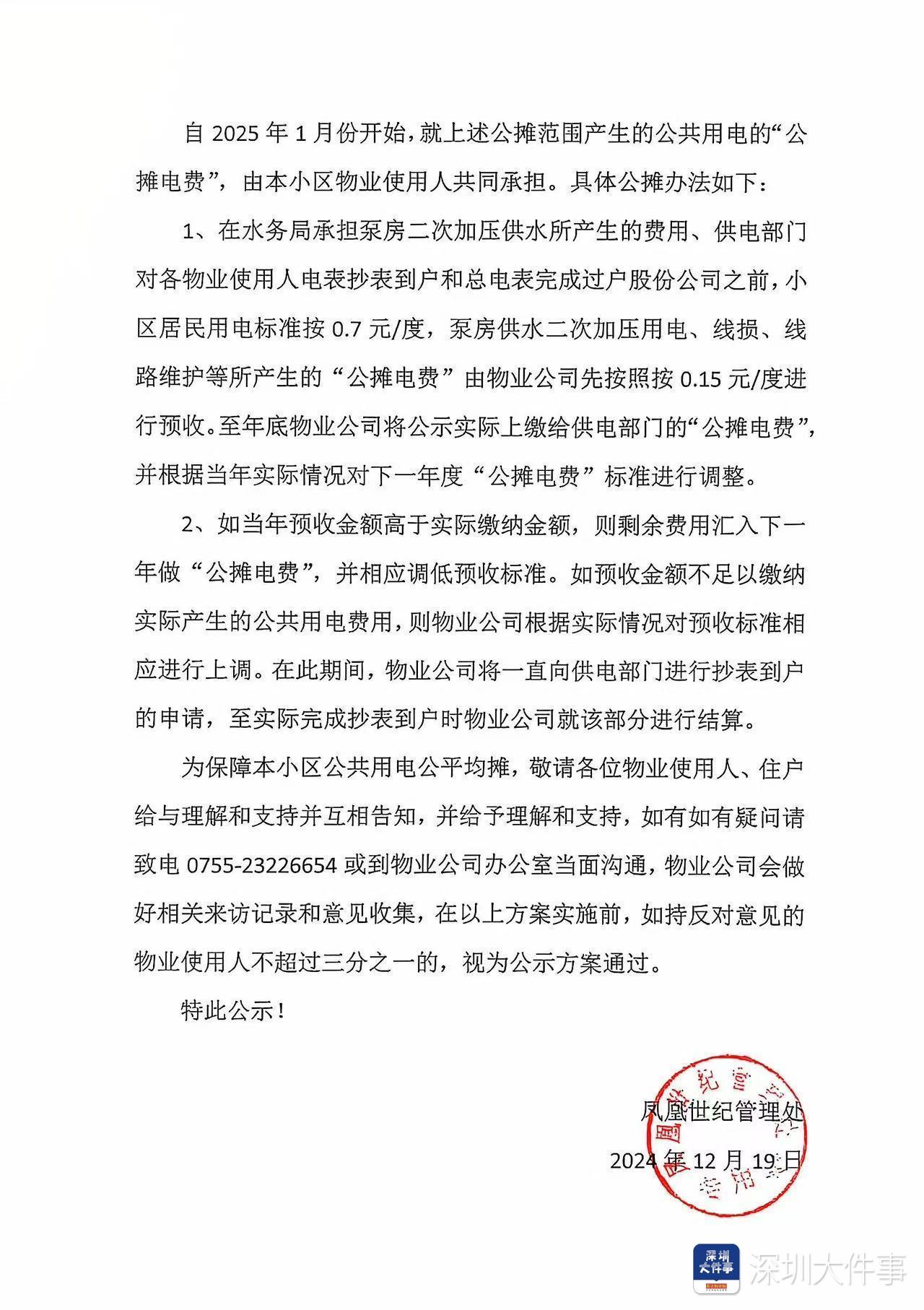 “从公示到通知,都是管理处单方面告知全体住户,所谓亏损也只是他们一家的说法。”住户罗先生表示,1月2日,凤凰世纪管理处贴出通知:自本月起,公摊电费将按照公示内容单独收取。而该小区的“公摊电费”标准,则是0.15元/度。