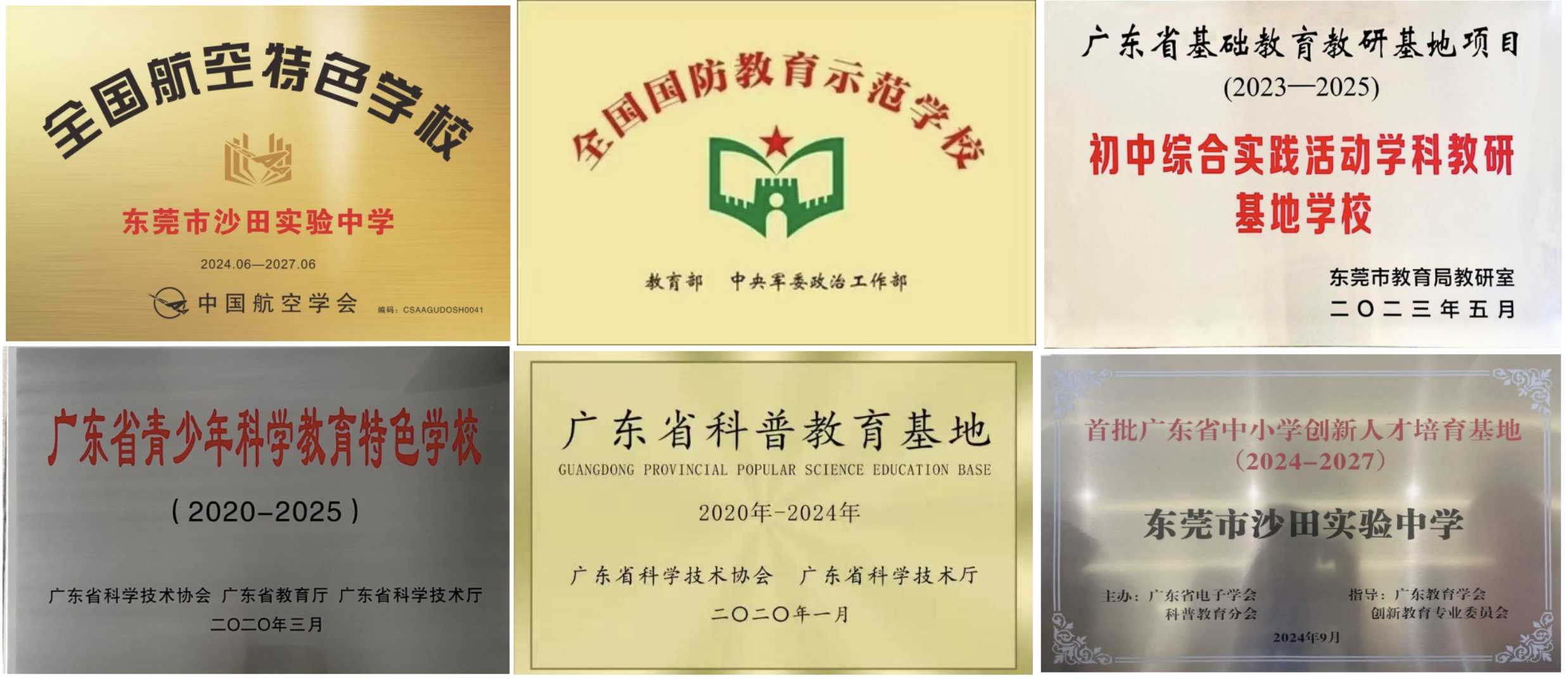 深耕细作结硕果,科学教育成效显著。经过多年探索,莞未沙田实验中学科学教育成果丰硕,形成“课程体系完善、实践平台多元、家校社协同”的特色发展模式。学校先后获评:全国航空特色学校、首批广东省中小学科学教育示范校、广东省科普教育基地等二十多项国家、省市级荣誉,科学楼与青少年宫成为区域科普教育标杆阵地。