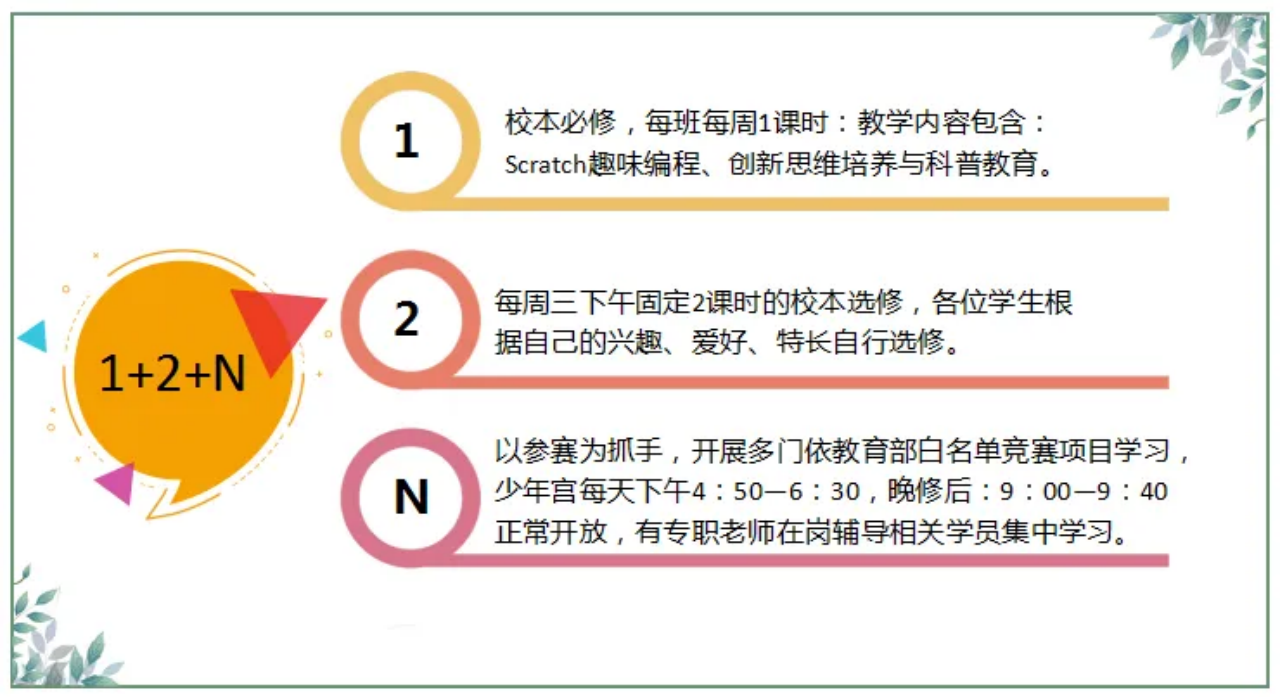 强师赋能课程。当前,学校构建“1+2+N”特色科学教育校本课程体系,全面普及科学教育,注重学生个性发展,积极播种科技创新种子;与此同时,与课程体系双向发力构建“四位一体”科创与STEM教育课程体系,即国家课程夯实基础,校本必修课程引领思维训练,涵盖人工智能、三模一建、编程等70多门校本选修课程满足个性化兴趣,校本竞赛课程助力拔尖培养。