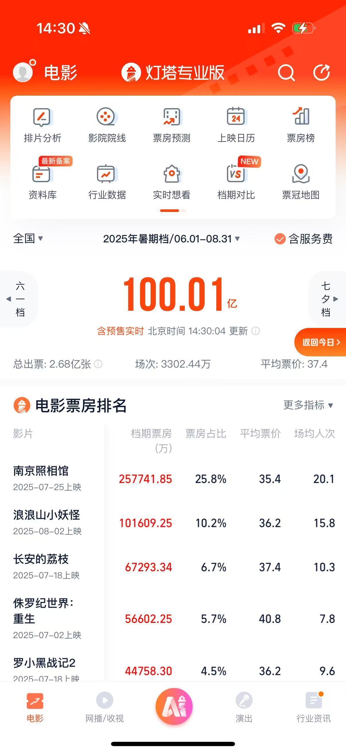 据网络平台数据,截至8月18日,2025年暑期档总票房(含预售)突破100亿元,总观影人次超2.6亿,广东省暑期档总票房超13亿元,贡献超13%,观影人次超3400万,继续稳居全国“第一票仓”。