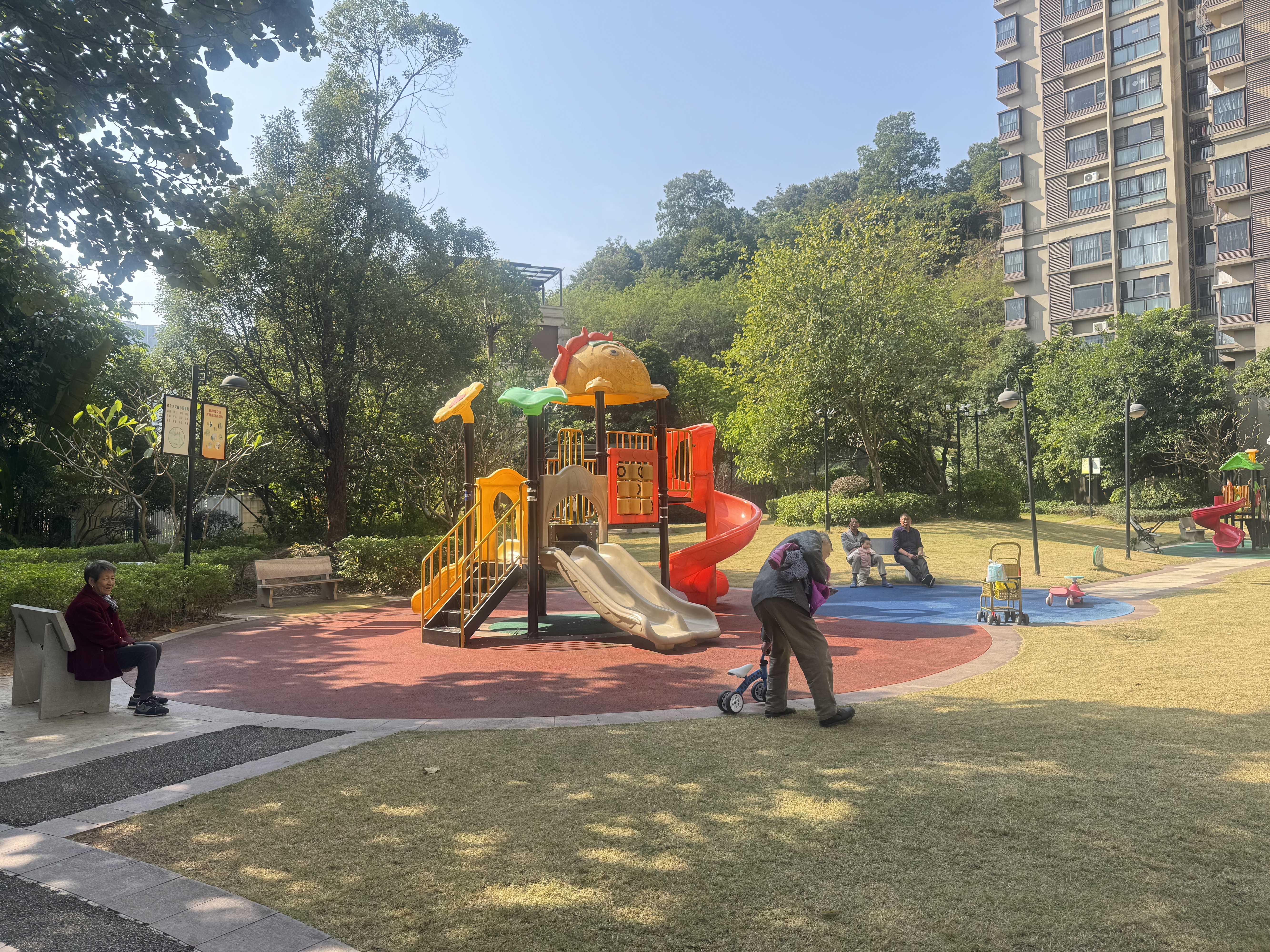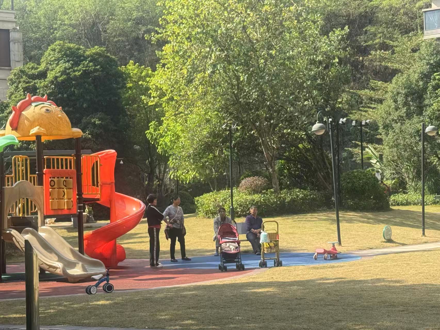 金融街融穗御府小区业主在修整好的草坪和游乐园休闲娱乐。 南方+记者 周中雨 摄