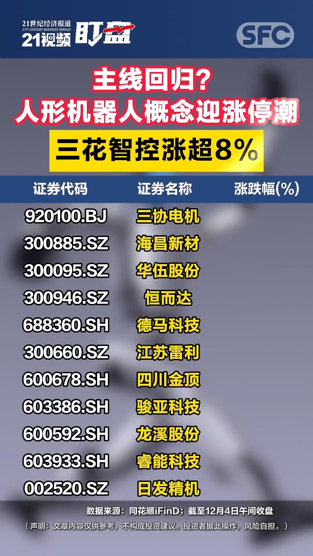 商业航天概念股集体异动。航天机电5天3板,中国卫星、海昌新材、龙洲股份、华伍股份等10多只个股涨停或涨超10%。消息面上,12月3日,朱雀三号可复用火箭首飞成功入轨。进入11月下旬以来,随着国家商业航天司设立、相关行动计划出台以及产业侧密集消息催化下,商业航天概念已异军突起,成为资本市场一大主线。