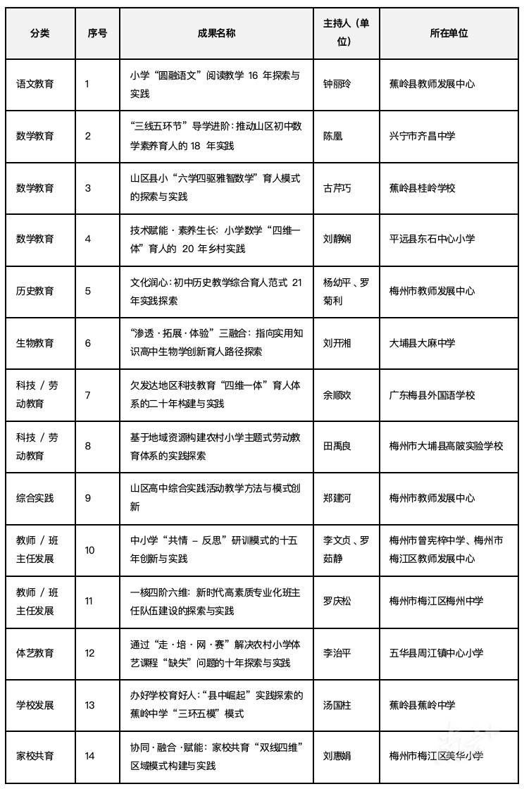 12月1日,广东省教育厅发布《关于2025年全省学校优秀教学成果奖(基础教育类)拟获奖成果名单的公示》,经自主申报、单位遴选推荐、资格审核、网络评审和集中评审,拟奖励基础教育类优秀教学成果449项,其中特等奖50项、一等奖150项、二等奖249项。梅州市14项入选二等奖,入选项目数位于全省上游。