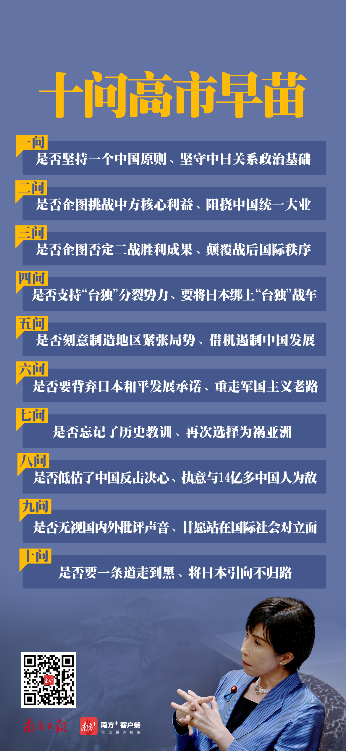 日本领导人狂妄挑衅,踩政治红线、开历史倒车,且拒不撤回错误言论,究竟意欲何为?这十个问题,高市必须说清楚!